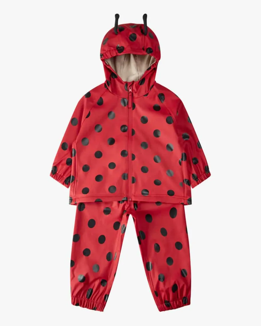Cinelle Regenanzug für Babys von Konges Slojd in Rot und Schwarz. Daszweiteilige Modell punktet mit niedlichem Punktemuster in Marienkäfer-Optik,während die wasserdichte Verarbeitung für angenehmen Tragekomfort sorgt.