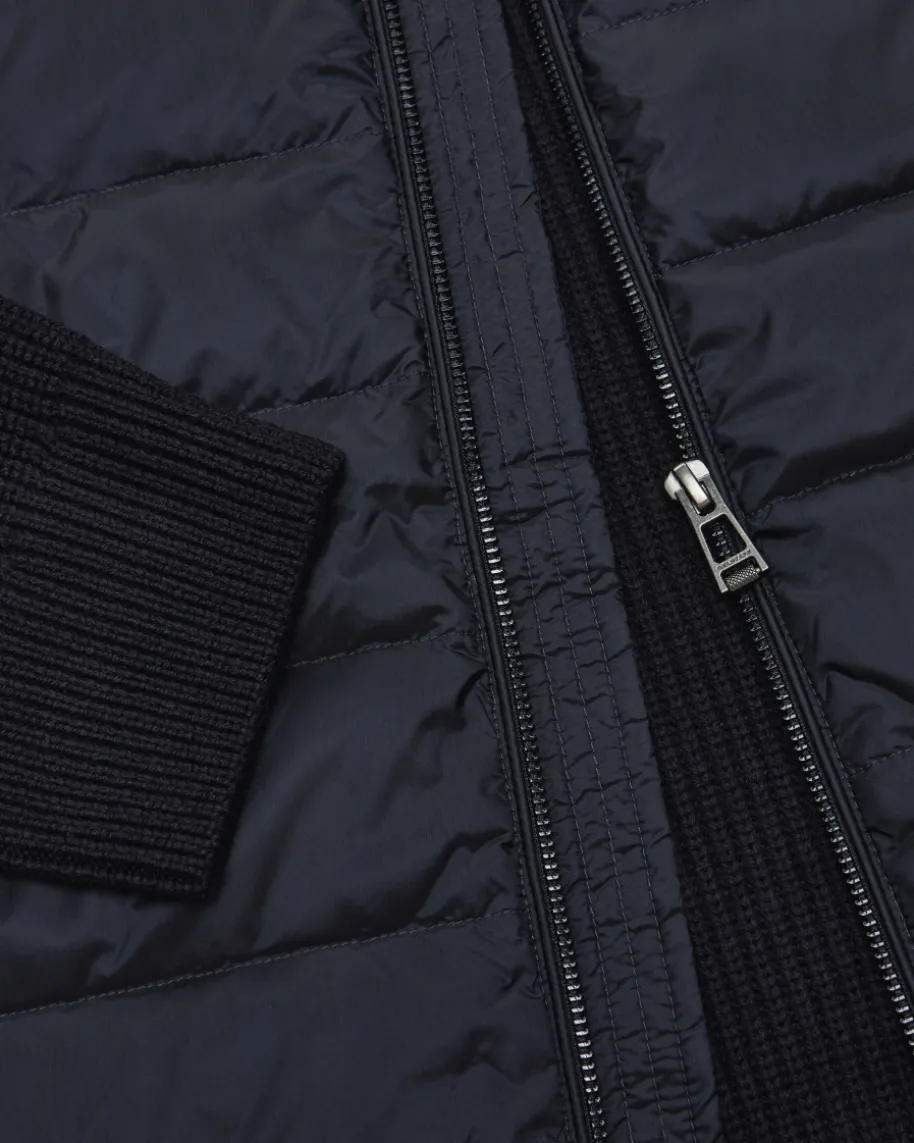 Circuiteer Hybrid-Strickjacke für Herren von Belstaff in Navy. Das Modellbegeistertdank der raffinierten Kombination aus leichten Wollstrick-Elementen undgesteppter Vorderseite mit hochwertiger Daunen-Füllung als sportiver Casual-Begleiter für die Übergangszeit.