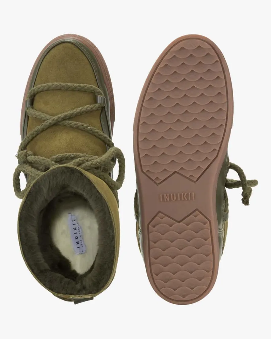 Classic Boots für Damen von Inuikii in Khaki. Zeitloses Design in Verbindung mitfunktionalem Komfort zeichnen dieses Modell aus. Während die wasserabweisendesowie schneedichte Eigenschaft einen praktischen Begleiter kreiert, hält Siedie Lammfell-Innenseite auch an kalten Tagen warm. Zugleich präsentiert sich dasModell durch die edle Veloursleder-Verarbeitung sowie die raffinierte Schnürungin modischer Aufmachung.