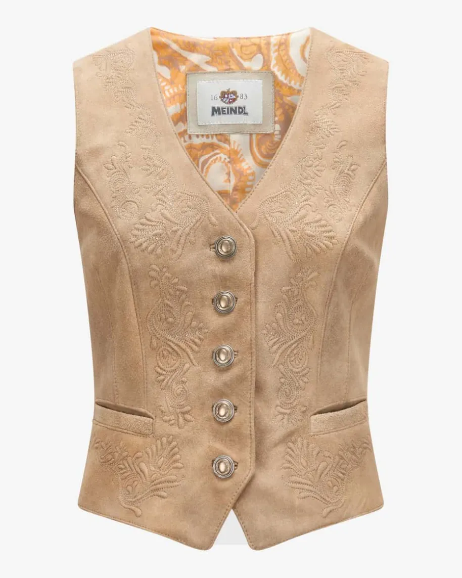 Clementine Trachten-Ledermieder für Damen von Meindl in Glacier. DasTraditionsunternehmen Meindl steht seit Jahrzehnten für traditionelle Handarbeitund höchste Qualität. Auch dieses exklusiv für LODENFREY entworfene Modell aushochwertigem Ziegenleder überzeugt mit taillierter Passform und weicherOberflächen-Verarbeitung. Bronzefarbene Wappenknöpfe und feine Zierstickereienrunden den Trachten-Look gekonnt ab.
