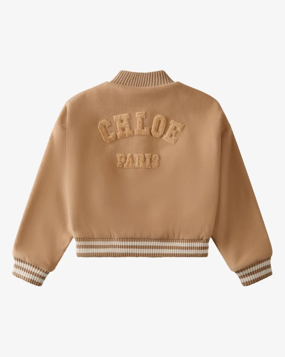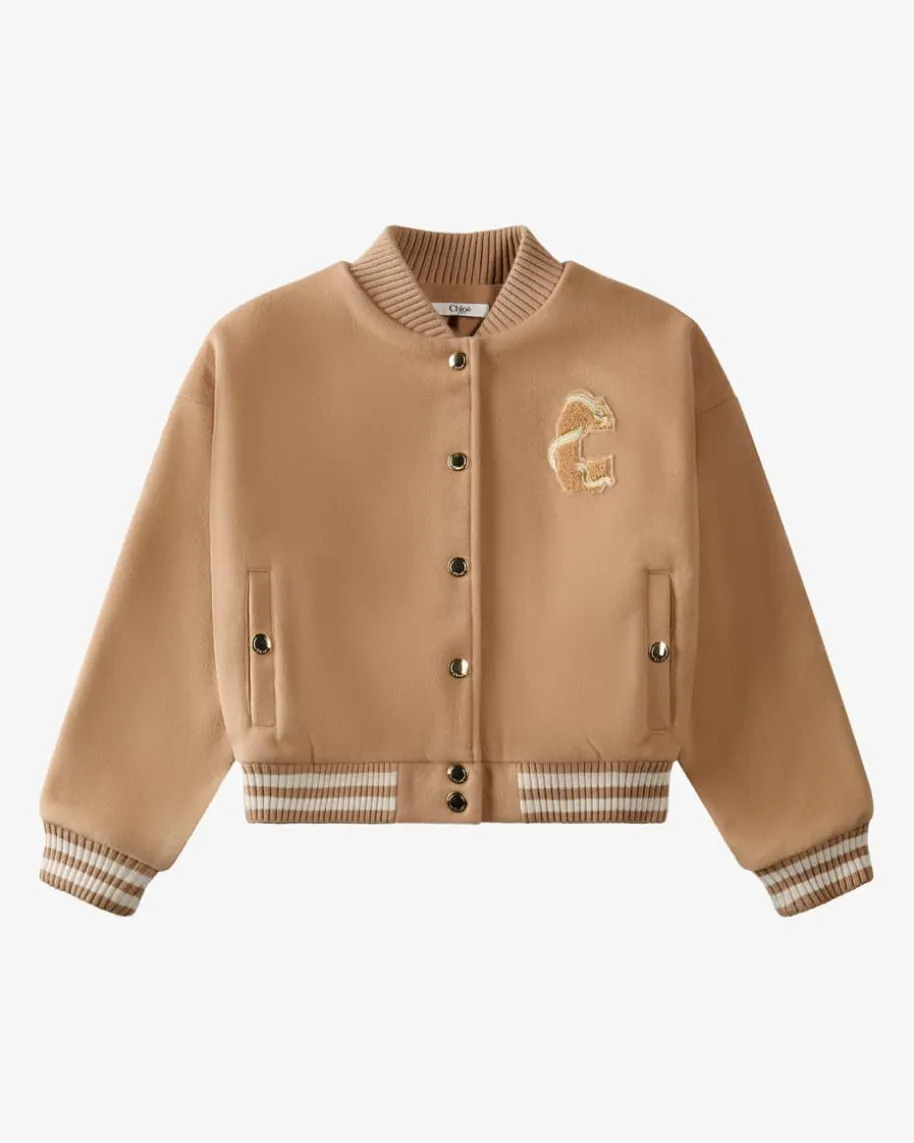 Collegejacke für Mädchen von Chloé Kids in Camel und Creme. Das Modell ausweichem Woll-Mix überzeugt mit sportiver Bomberjacken-Silhouette undcharakteristischen College-Details wie den Streifen-Akzenten und beidseitigenLogo-Applikationen als modischer Begleiter für die Übergangszeit.