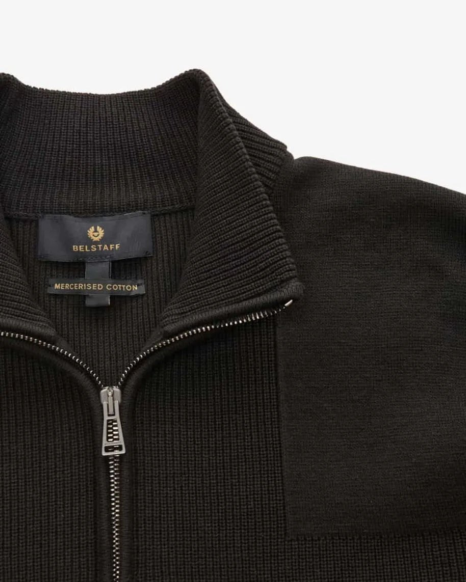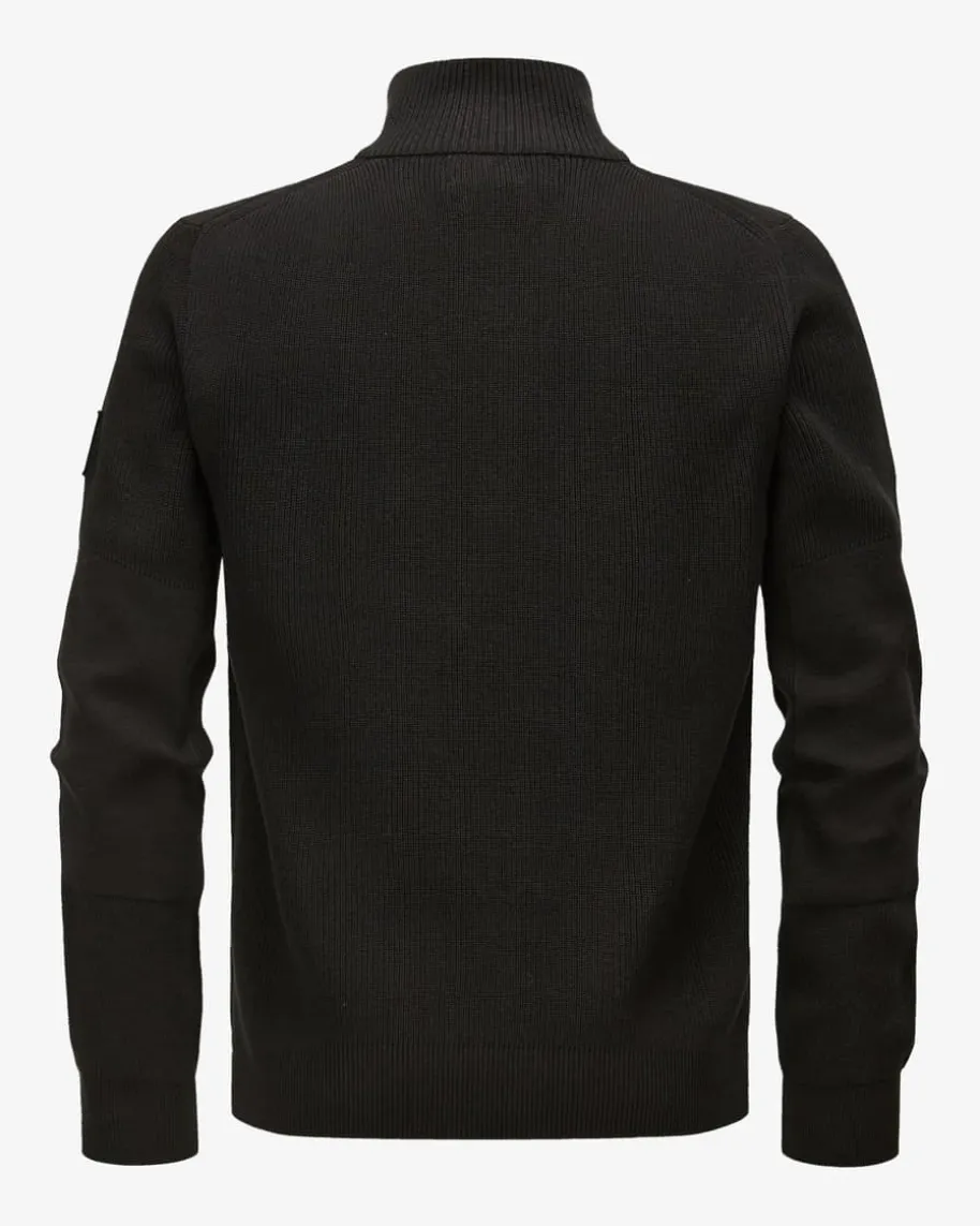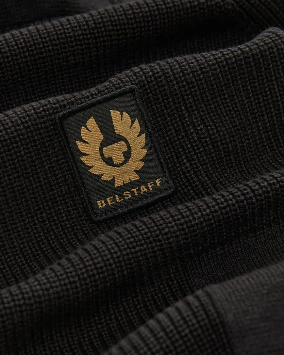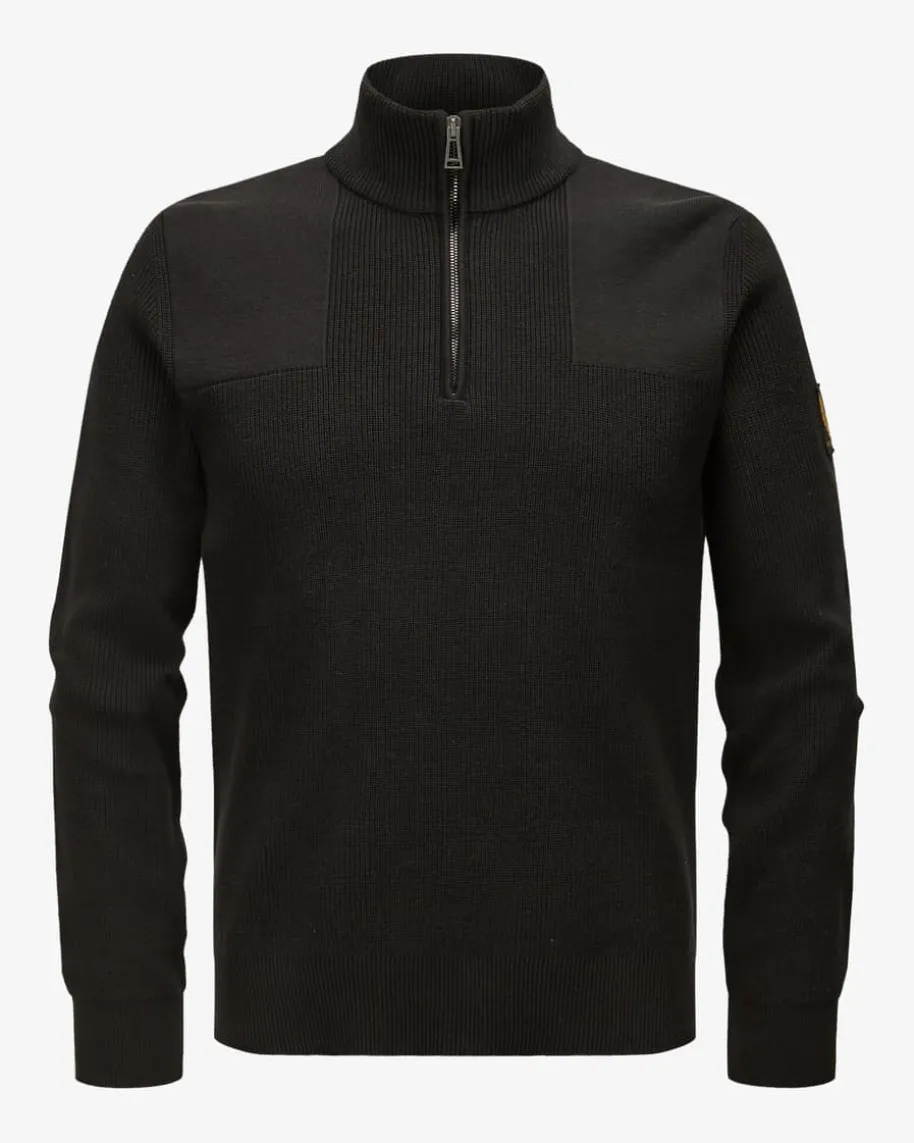 Commander Troyer für Herren von Belstaff in Schwarz. Das Modell ausmerzerisierter Baumwolle besticht neben der angenehmen Rippstrick-Haptik auchdank dem Half-Zip-Design als modisch-maskuliner Favorit mit labeltypischemÄrmel-Patch.
