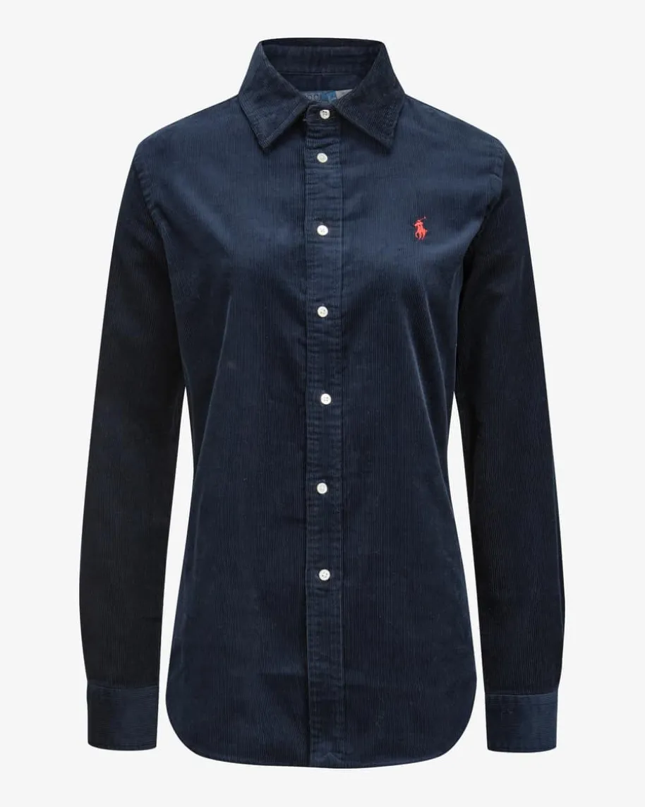 Cord-Hemdbluse Slim Fit für Damen von Polo Ralph Lauren in Navy. Das Modellpräsentiert sich dank der soften Cord-Qualität als moderner Favorit imOvershirt-Stil, welcher durch die kontrastierende Poloreiter-Stickereilabeltypisch inszeniert wird.