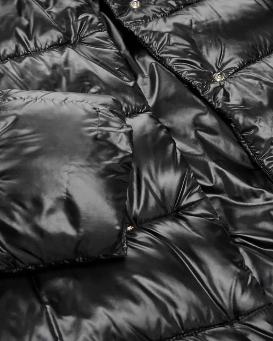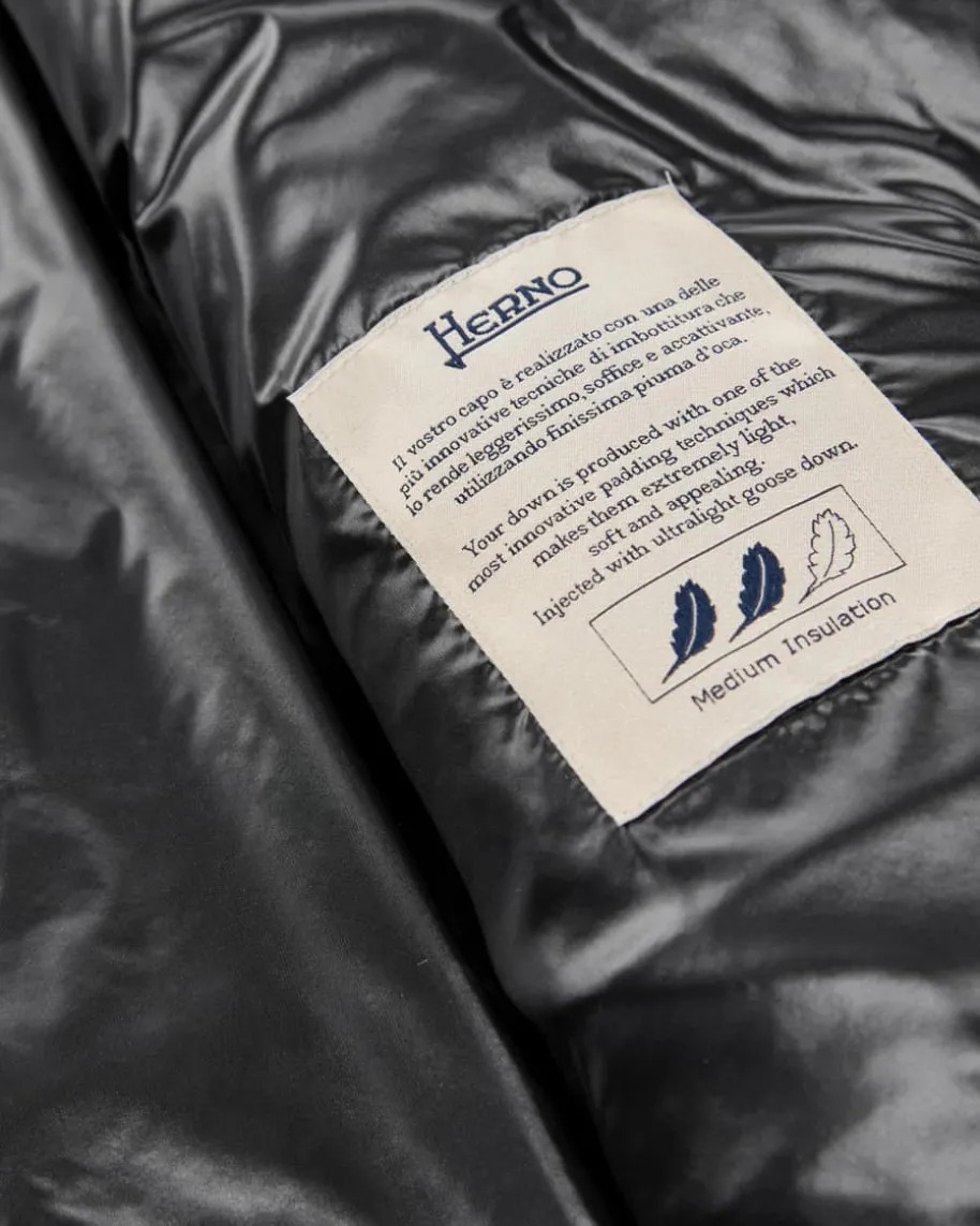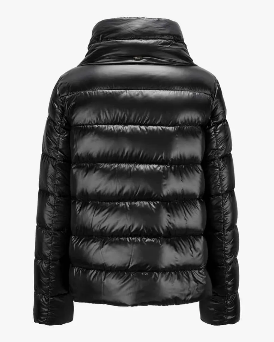 Daunenjacke für Damen von Herno in Schwarz. Das italienischeTraditionsunternehmen entwirft seit vielen Jahren luxuriöse Jacken. ZeitloseSchnitte, traumhafte Farben sowie pure Eleganz begeistern genauso, wie einehochwertige und federleichte Daunen-Fütterung. Dieses Modell begeistert zudemmit raffinierten geknöpften Seitenschlitzen und modischer, kurzer Passform.