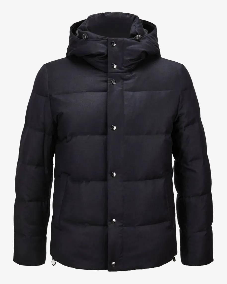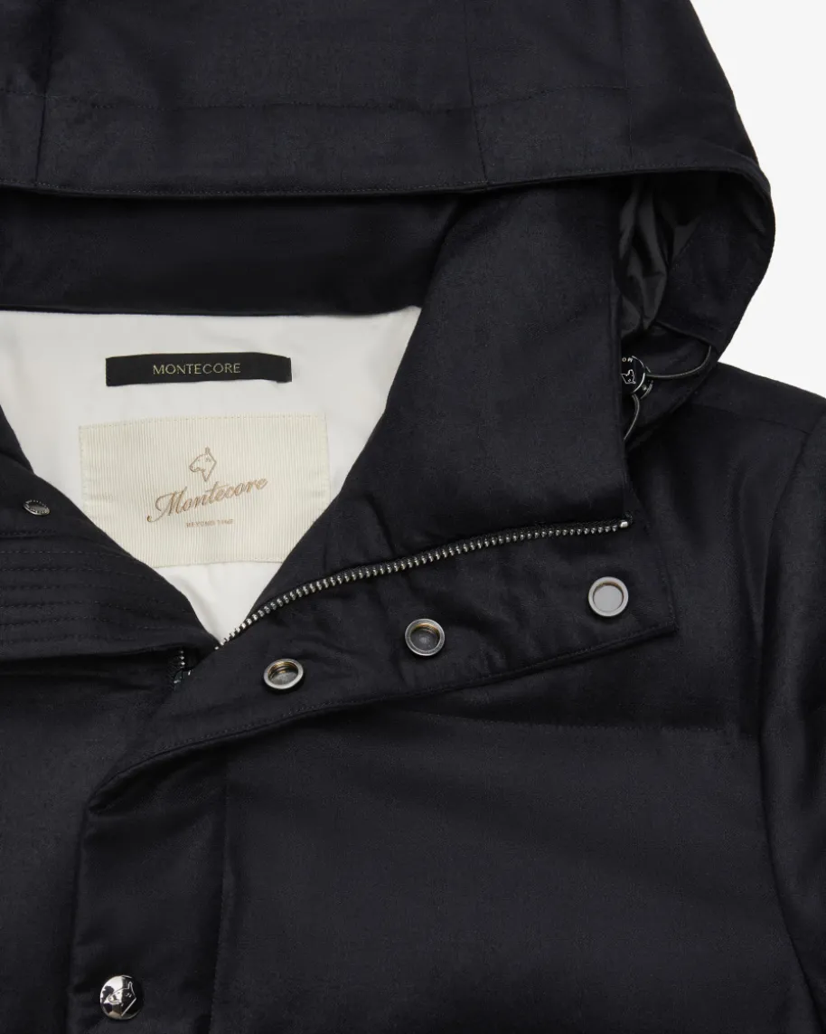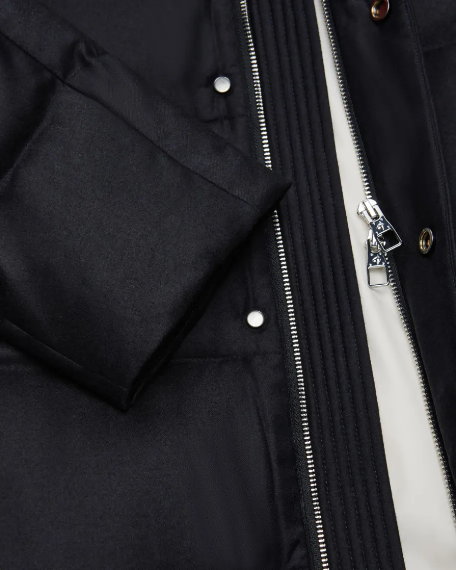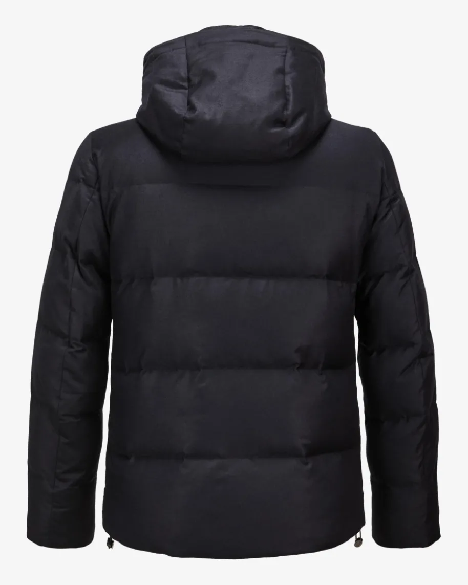 Daunenjacke für Herren von Montecore in Navy. Das Modell punktet dankhochwertigem Schurwoll-Seiden-Mix mit einer angenehmen Haptik, welche durch dasLoro Piana Rain System mit wasser- und windabweisender Eigenschaft punktet – Einfunktionaler Begleiter mit Stil.