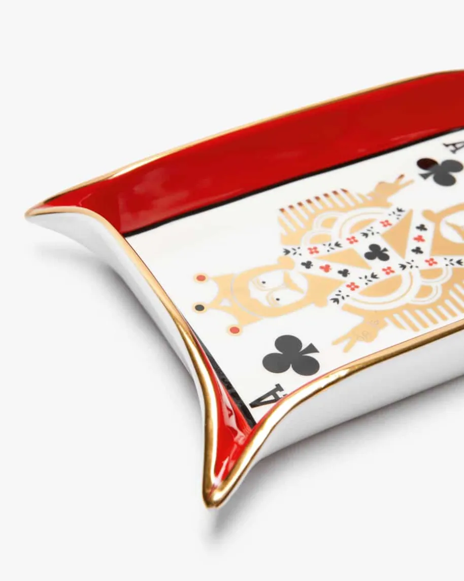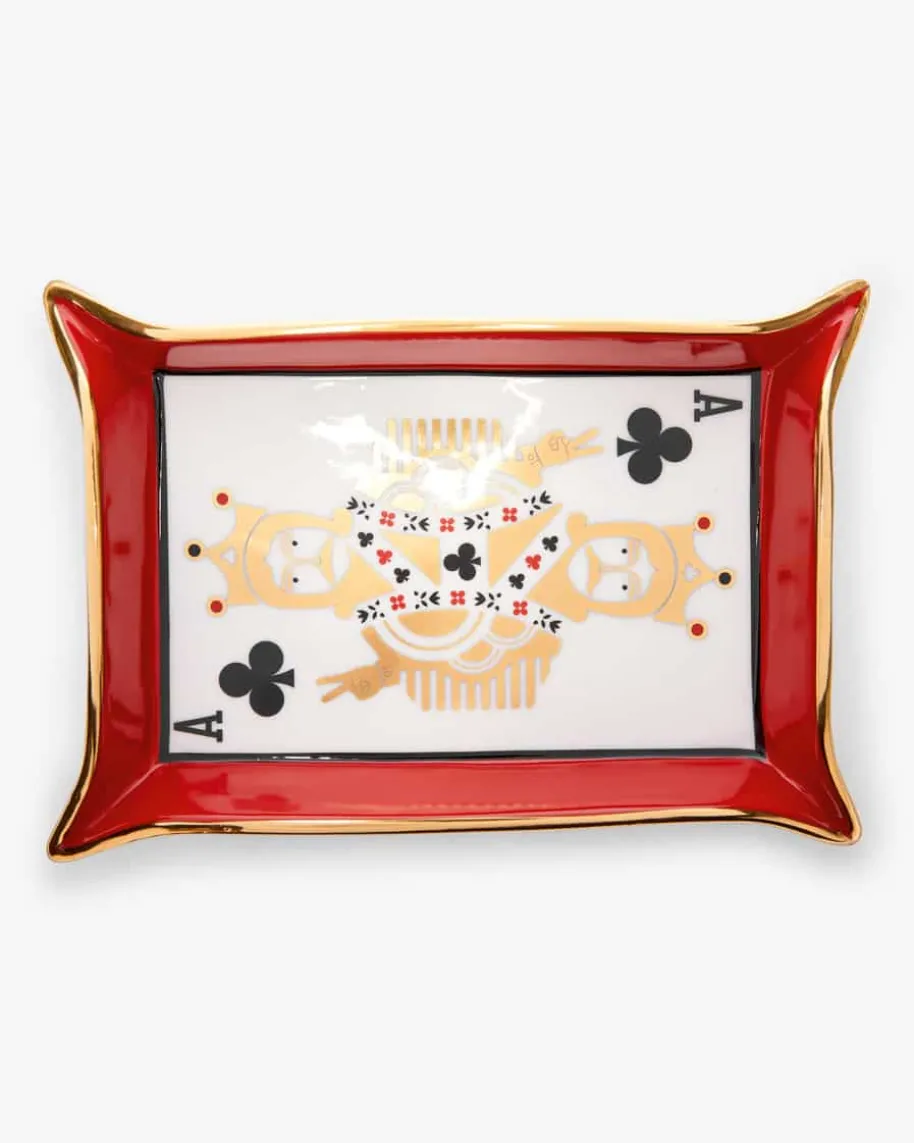 Dealer’s Choice Valet Schale von Jonathan Adler in Rot, Weiß und Gold. Der NewYorker Star-Keramiker präsentiert mit seinen Kreationen einzigartige Interior-Designs. Auch diese modische Schale mit markantem Spielkarten-Motiv undgoldfarbenen Details eignet sich hervorragend als Ablage für ihre Kleinigkeiten.