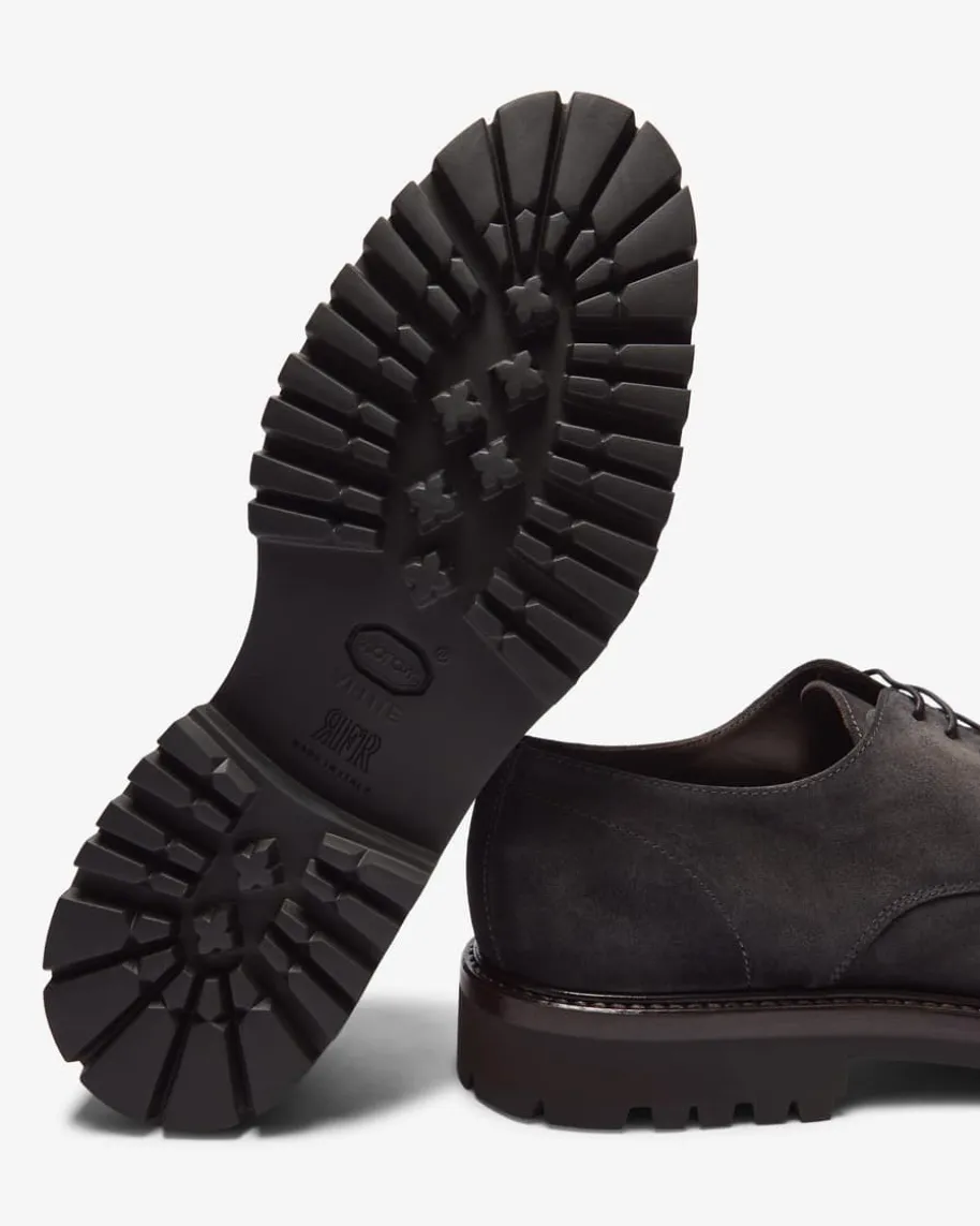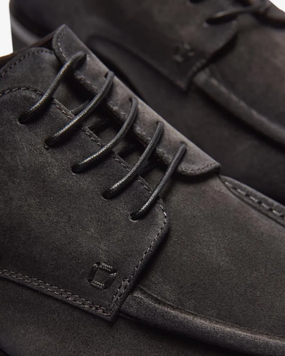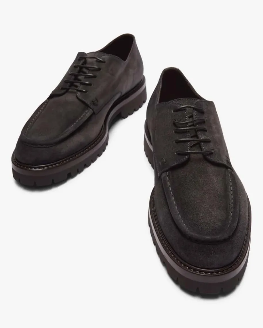 Derby-Schuhe für Herren von Fabiano Ricci in Anthrazit. DasHalbschuh-Modellbesticht durch die Kombination aus maskulinem Boot-Designmit markanter Vibram-Profilsohle und Derby-Elementen, während die Verwendung vonhochwertigem Kalbs-Veloursleder den modernen Look gekonnt ergänzt.