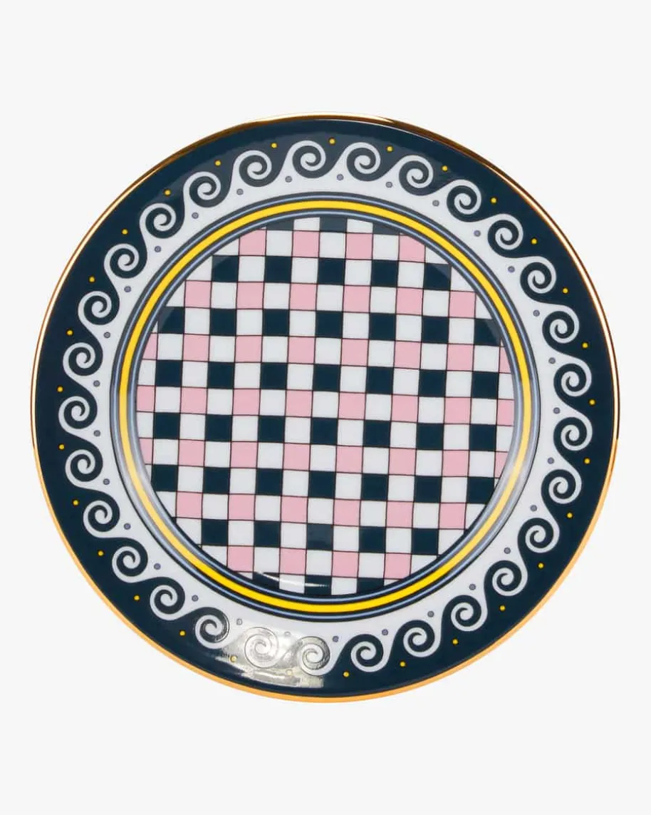 Dessert-Teller 2er-Set von La DoubleJ in Dunkelblau, Rosa und Weiß. Aus feinstemitalienischem Porzellan gefertigt, präsentiert sich das Teller-Set dank deshandgefertigten 18-karätigen Goldrands in edler Aufmachung. Die feinengeometrischen Odysseus-Muster lassen die Servierteller zum kulinarischen Deko-Highlight avancieren.