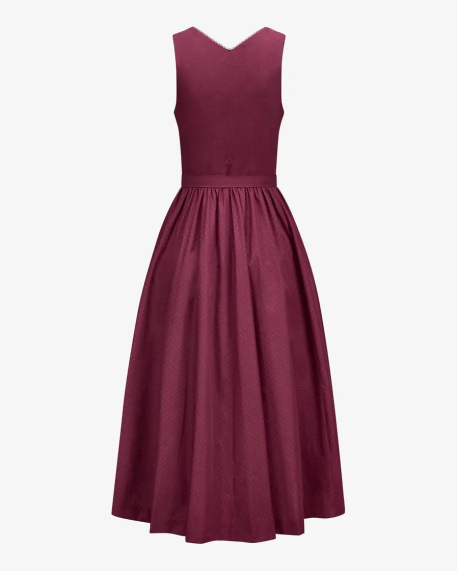 Dirndl lang mit Schürze für Damen von LODENFREY München 1842 in Bordeaux. Dankder Verwendung von hochwertiger Leinen-Qualität im Mieder und einem feinenPunkte-Muster im Baumwoll-Rock wird ein traditioneller Favorit mitminimalistischem Charme kreiert. Die tonige Schürze rundet das Gesamtbildharmonisch ab.