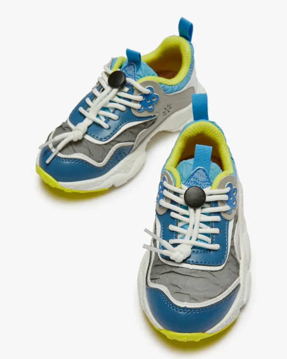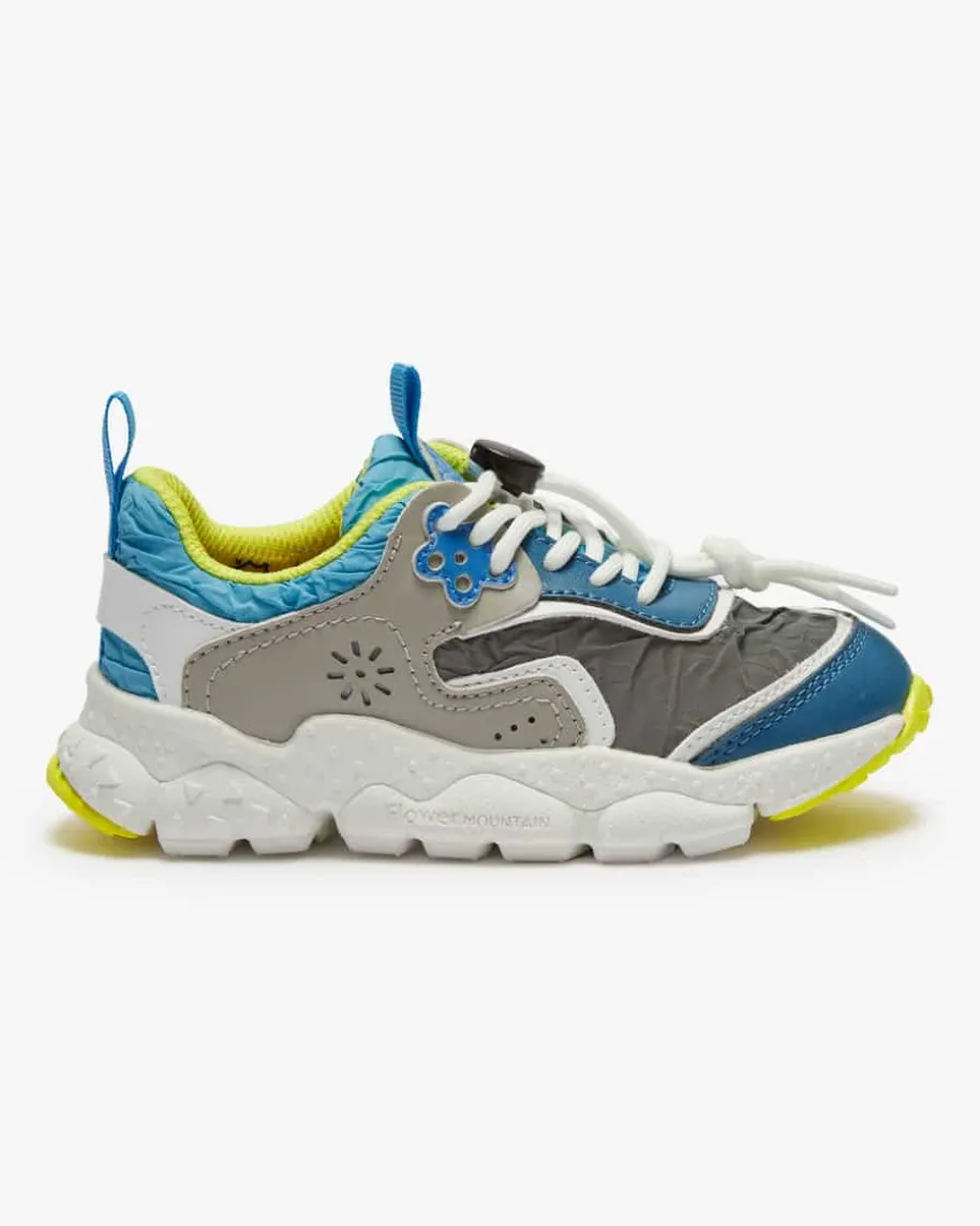 Doi Junior Sneaker für Kinder von Flower Mountain for Naturino in Grau, Türkisund Weiß. Das vegane Modell begeistert mit modischem Chunky-Design und gekonntemMaterial-Mix, während der One Pull-Verschluss für ein leichtes An- und Ausziehensorgt.