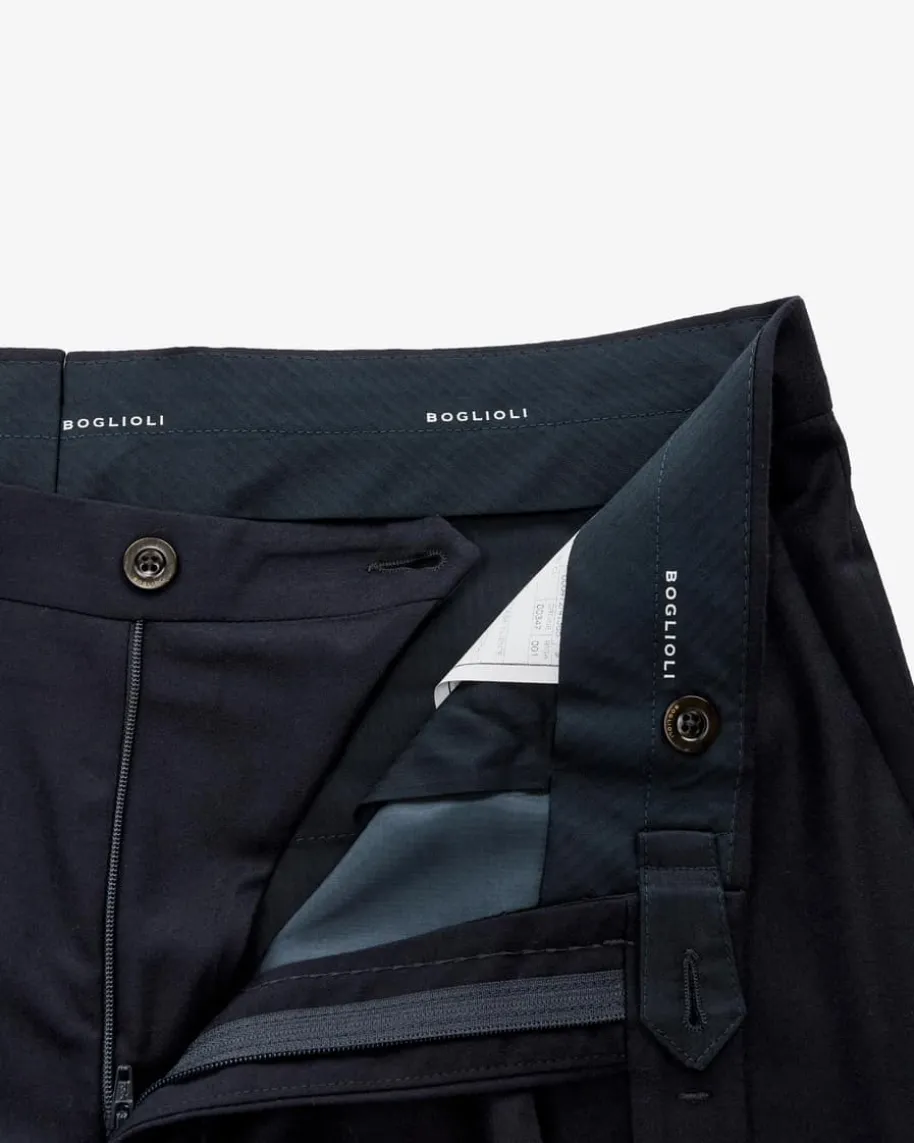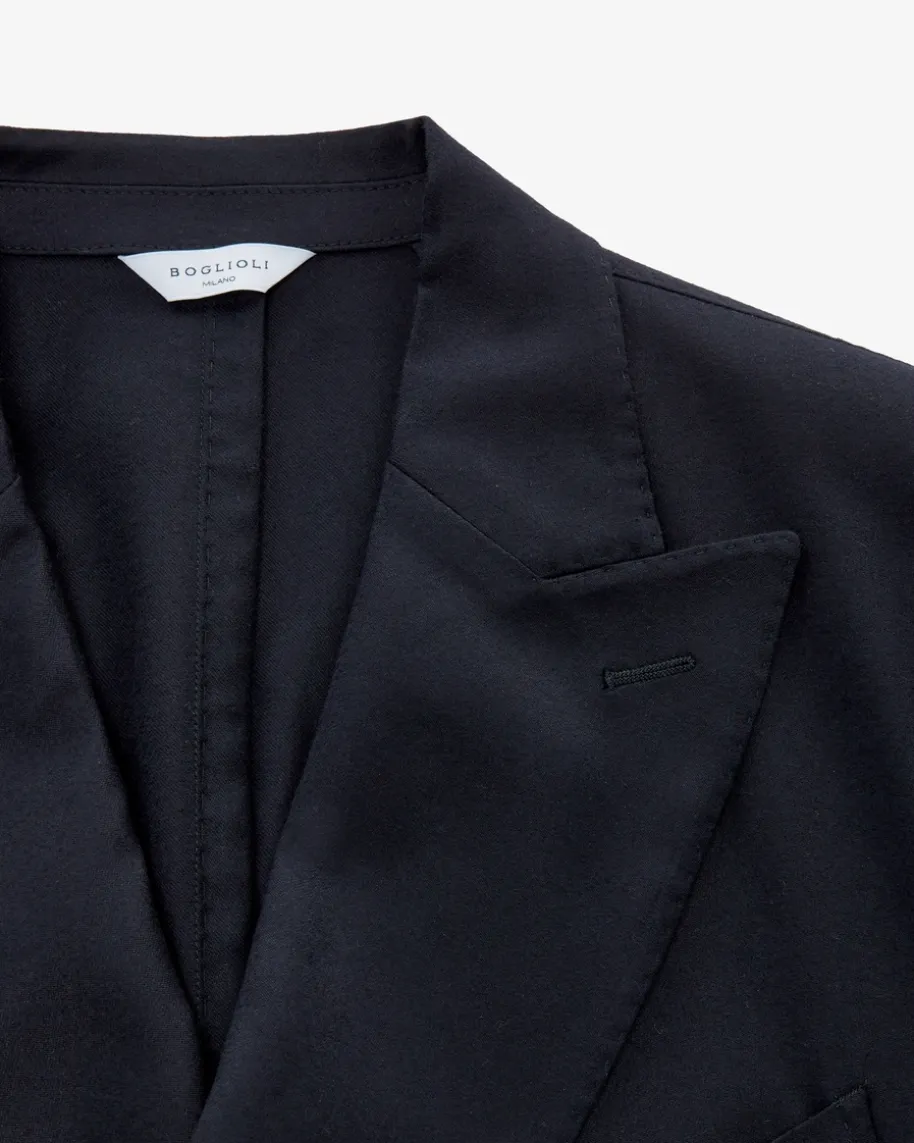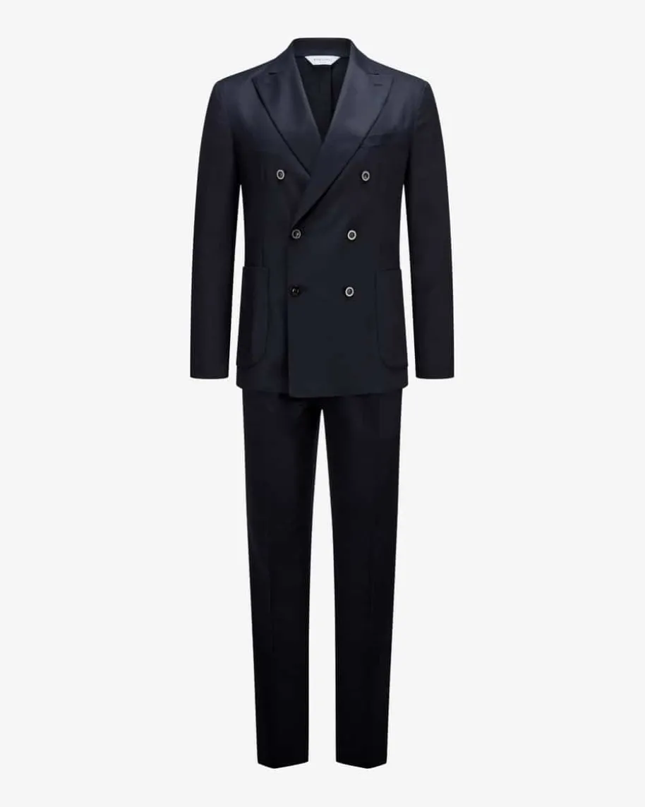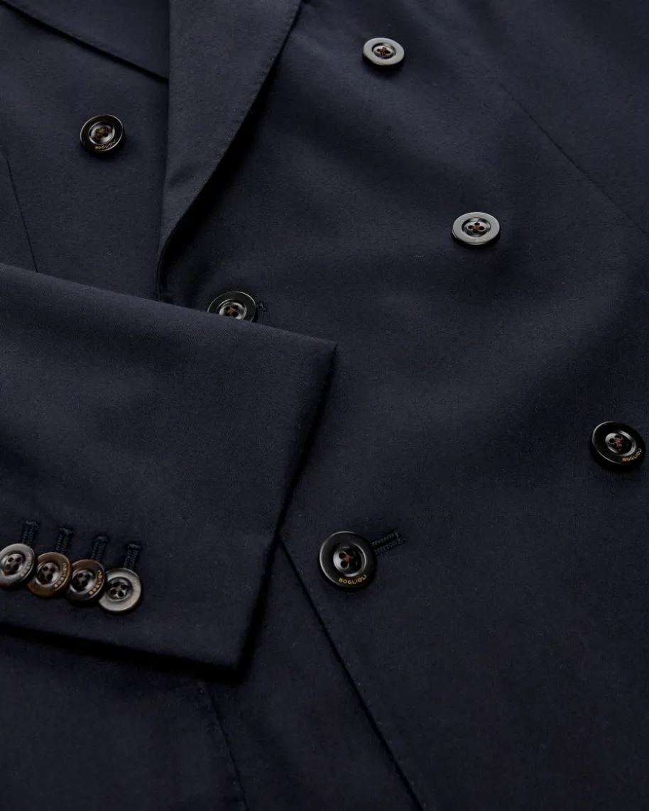 Doppelreiher-Anzug für Herren von Boglioli in Navy. Made in Italy – Elegant undmodern zugleich begeistert dieses ungefütterte Modell mit zweireihigerKnopfleiste und markantem Spitzrevers. Zugleich überzeugt der hochwertigeSchurwoll-Seiden-Mix in weicher Flanell-Haptik sowohl haptisch als auch optisch.