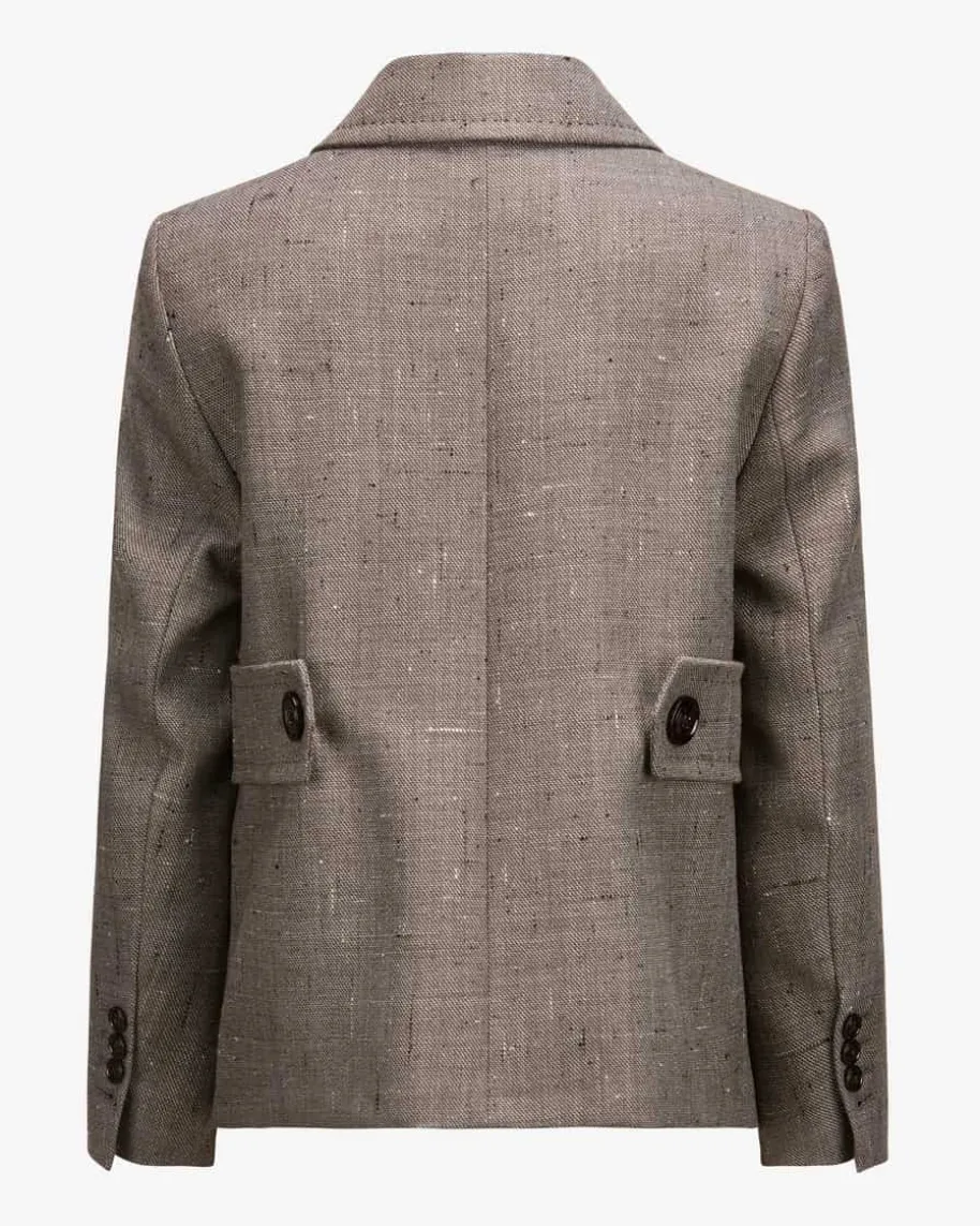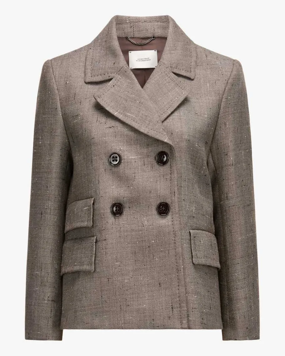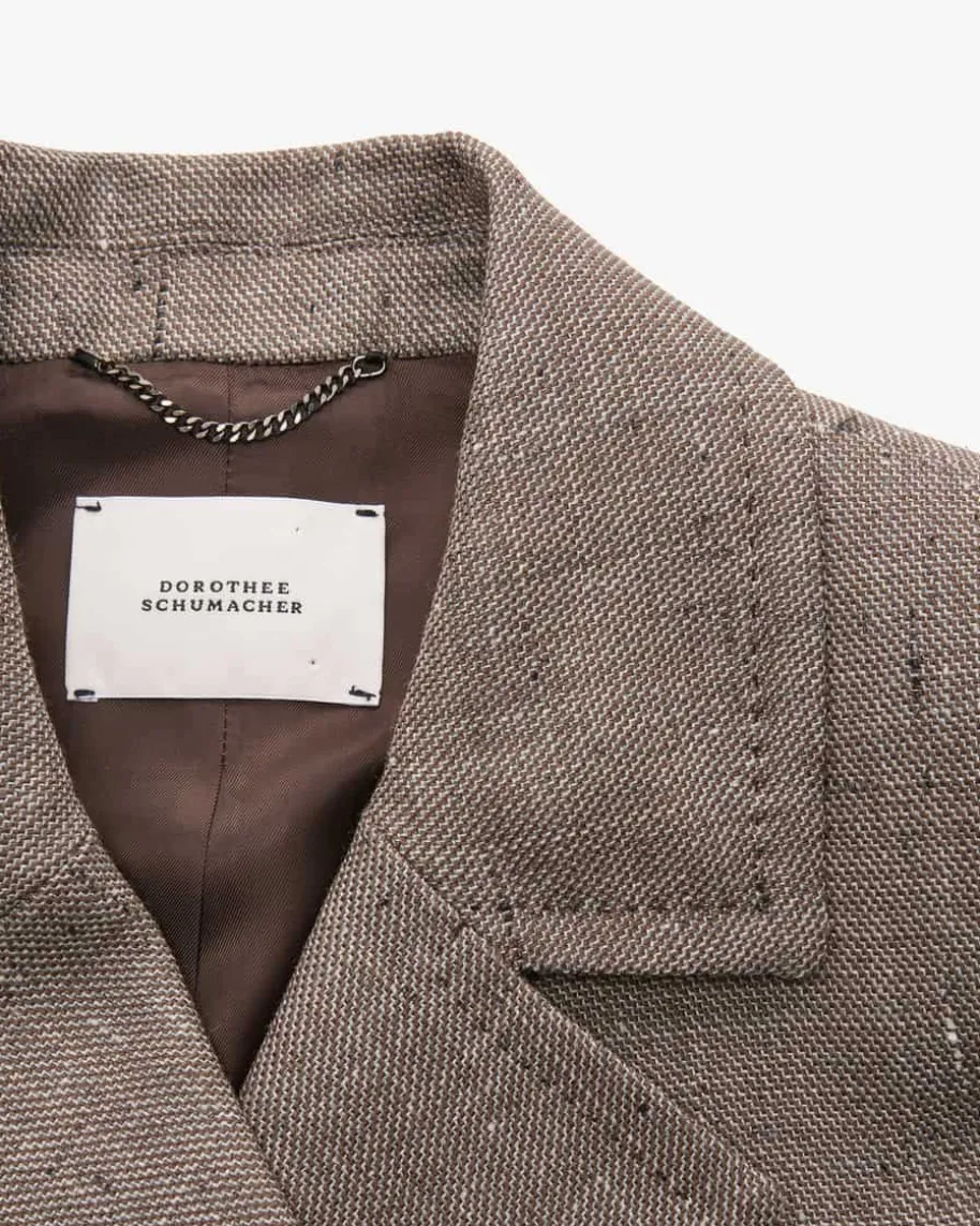Doppelreiher-Blazer für Damen von Dorothee Schumacher in Schokolade. FemininePower aus Deutschland – Dorothees Looks verbinden Stärke mit verspielterEleganz. Auch dieses Modell präsentiert sich mit klassischen Details undhochwertiger Schurwoll-Qualität – ein femininer Begleiter für elegante Looks.