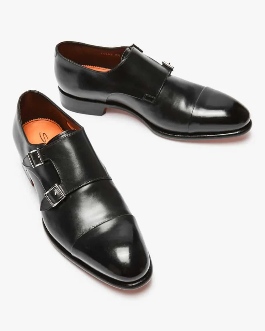 Double-Monks für Herren von Santoni in Schwarz. Die mit einer edlen Ledersohle versehenen Double-Monks des italienischen Modelabels sind aus hochwertigem Leder gefertigt. Zwei seitliche, verstellbare Riemen mit metallischer Schließe zieren den exklusiven und handgefertigten Herrenschuh, während Abnäher an der spitz zulaufenden Kappe die Aufmachung gekonnt abrunden.