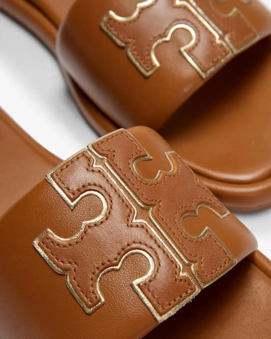 Double Sport Slide Pantoletten für Damen von Tory Burch in Cognac und Gold. Dankderhochwertigen Leder-Qualität wird ein edler, extravaganter Look geschaffen.Zugleich ziert eine stilvolle Logo-Applikation den breiten Riemen.