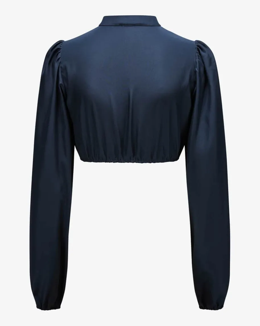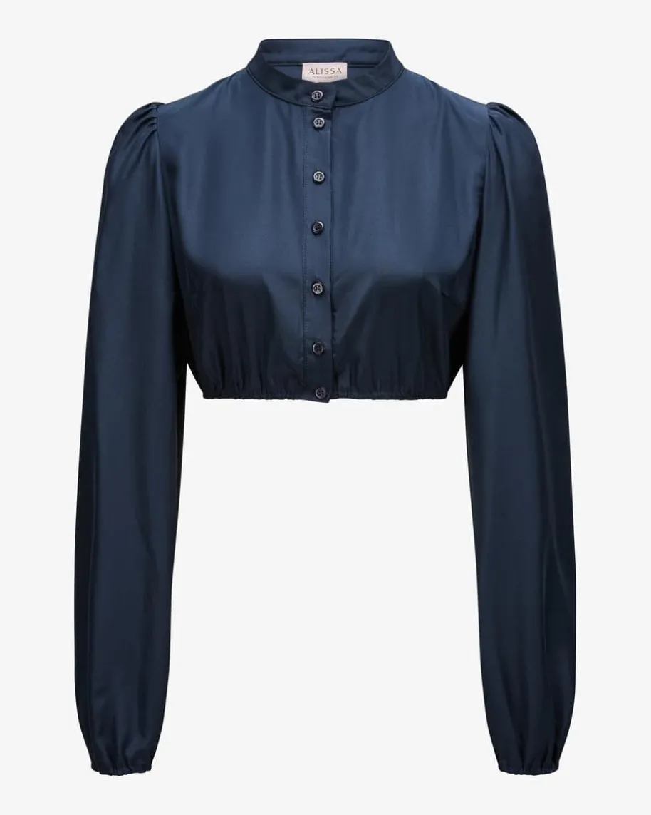 Elena Dirndlbluse für Damen von Alissa by Kinga Mathe in Nachtblau. Das Modellpräsentiert sich mit changierender Material-Qualität, während die weiten Ärmelzudem modische Akzente setzen.