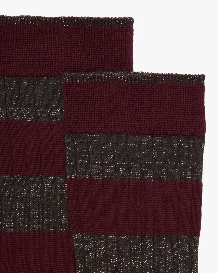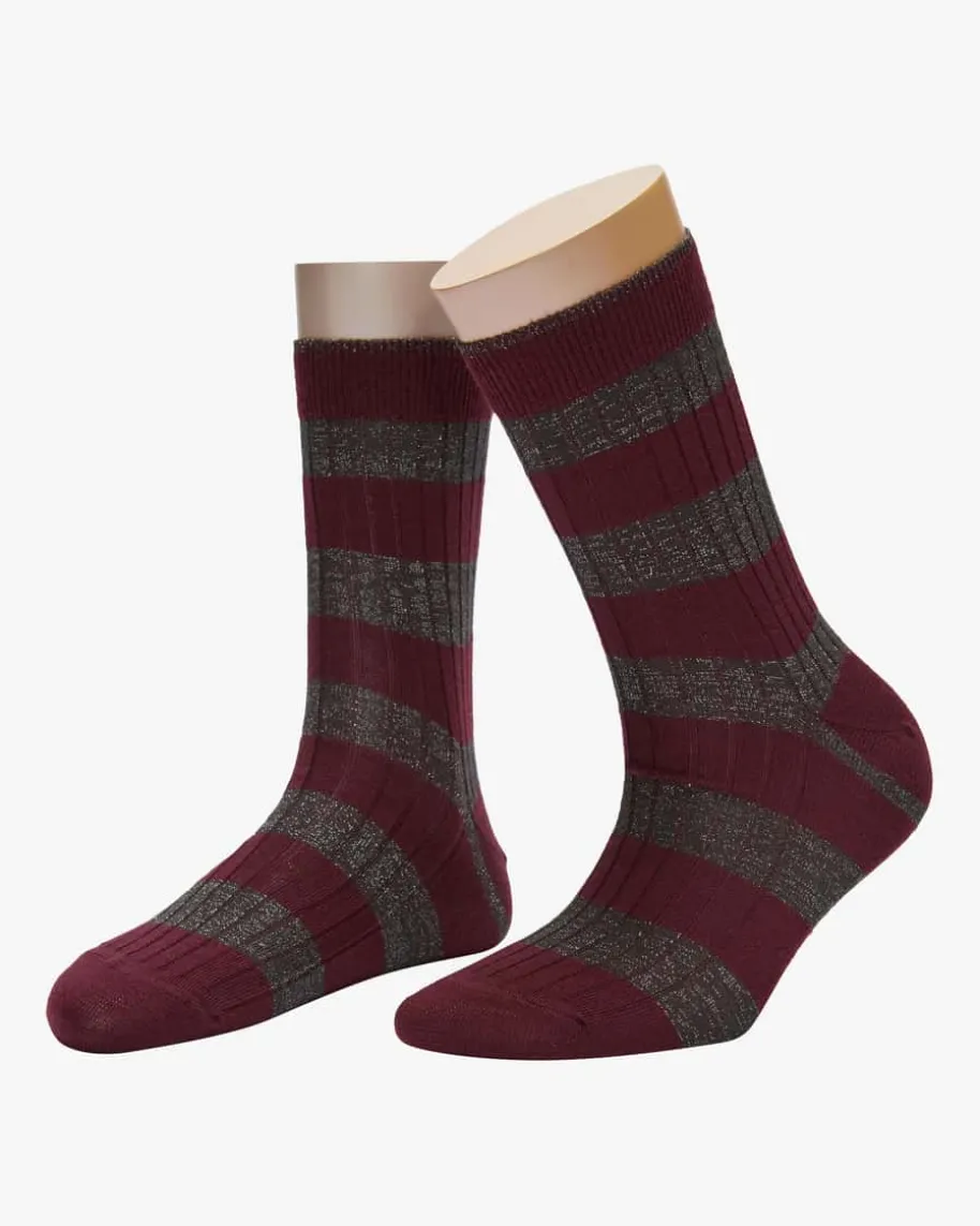 Elodie Strümpfe für Damen von Alto in Bordeaux und Dunkelbraun. Made in Italy -1923 gegründet, zeichnet das Unternehmen die Verbindung von Tradition undExzellenz aus. Die Socke ist nicht nur ein Modeaccessoire, sondern interpretiertden Stil und die Persönlichkeit des Trägers. Auch dieses Modell mit Rippstrick-Elementen begeistert dank changierenden Glitzerfasern und Blockstreifenmuster inmodischer Aufmachung.