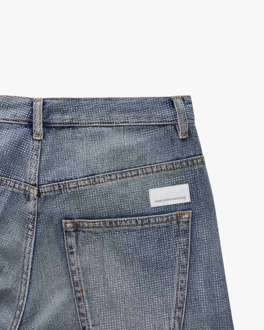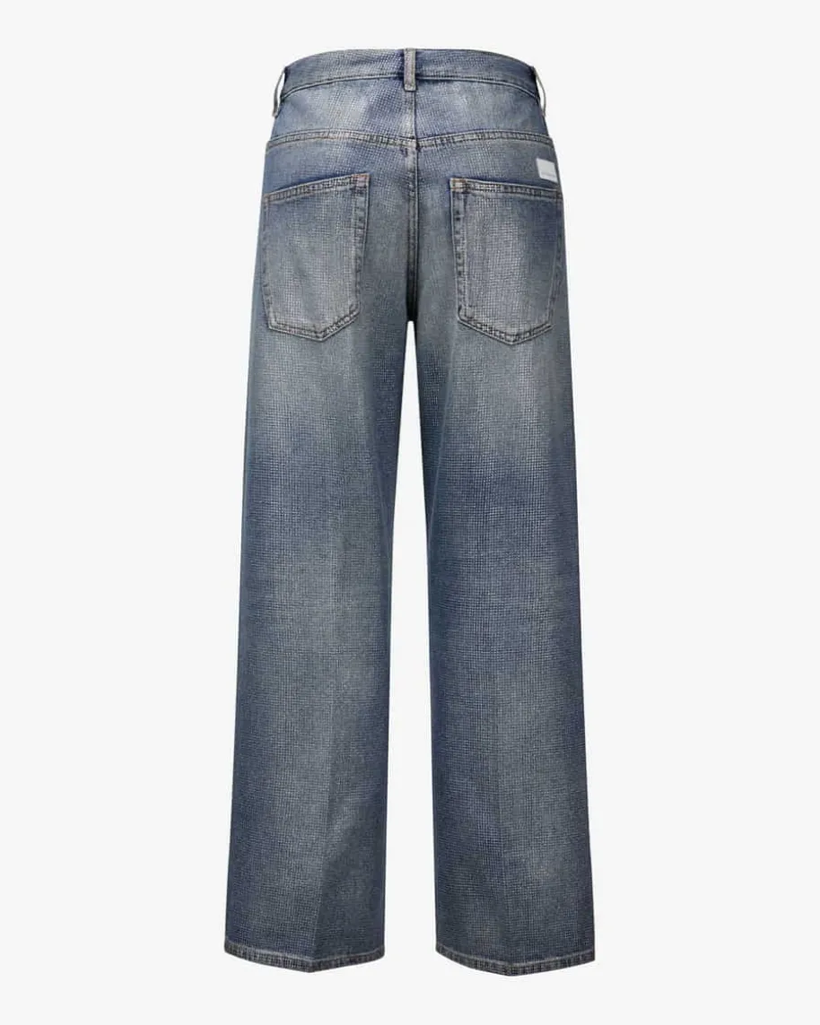 Elsa Jeans für Damen von nine:inthe:morning in Blau und Silber. Dieses Modellpräsentiert sich mit weitem Bein und verkürzter Passform und avanciert durch denmodischen Glitter-Print zum femininen Highlight in Ihrer Garderobe.