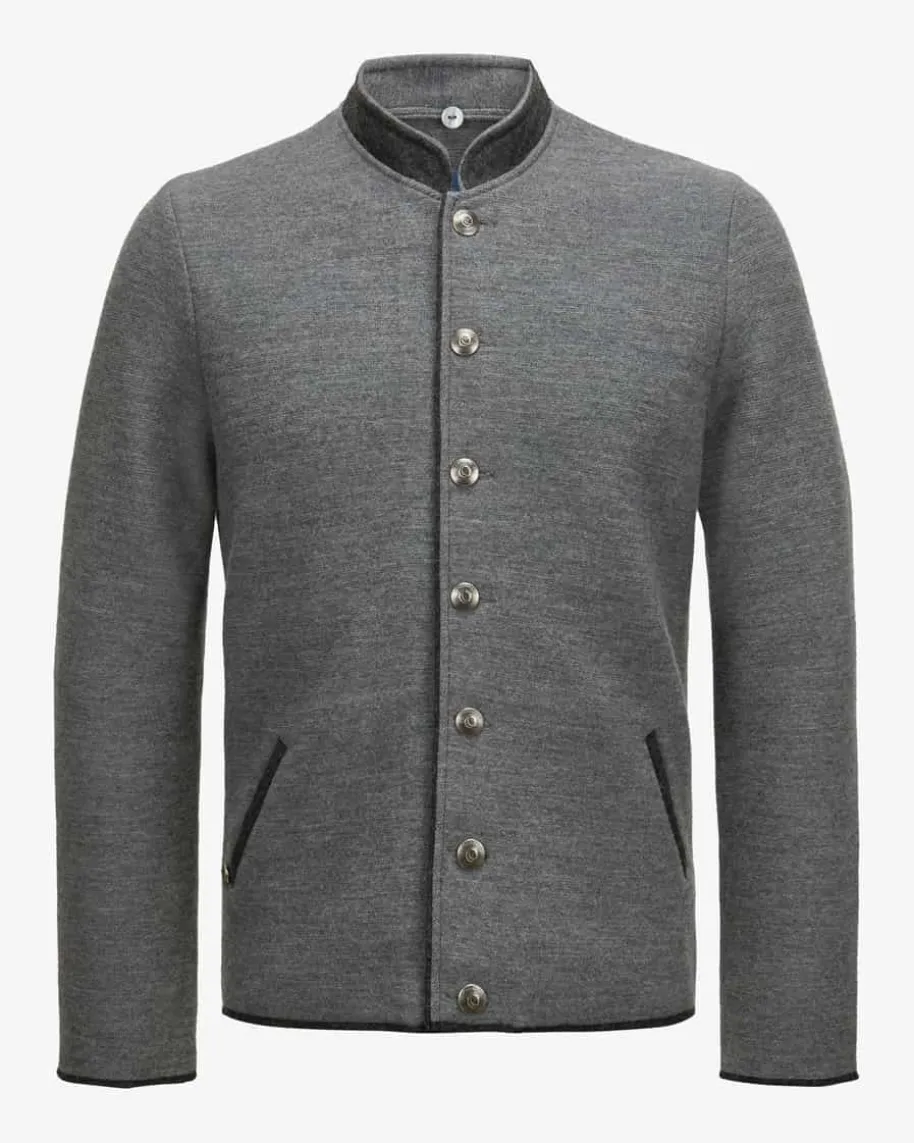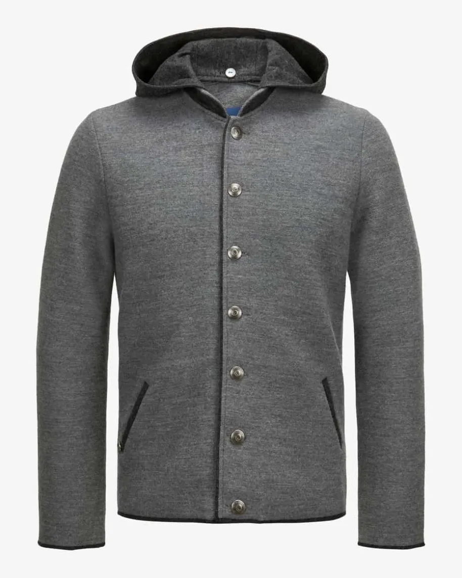 Emilian Trachten-Strickjacke für Herren von Litzlfelder Strickmoden in Grau undAnthrazit. Tracht mit Charakter und Liebe zum Handwerk – Als Teil deroffiziellen„Oktoberfest München“ Lizenz-Kollektion besticht das Modell mit dezentenOktoberfest-Signets auf den Knöpfen. Zudem sorgt die Merinowolle mit besondersweichem Griff für ein angenehm-wärmendes Tragegefühl, während die abnehmbareKapuze eine sportive Note verleiht.