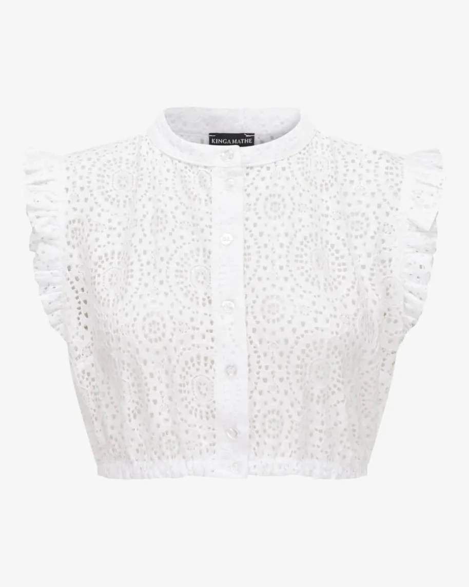 Emma Dirndlbluse für Damen von Kinga Mathe in Weiß. Das Modell überzeugt danksemi-transparenter Spitzen-Verarbeitung in femininer Aufmachung, während diedezenten Flügelärmel und der schmale Stehkragen den Trachten-Look mitromantischer Note vollenden.