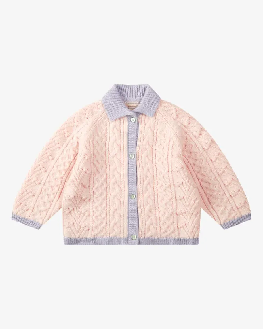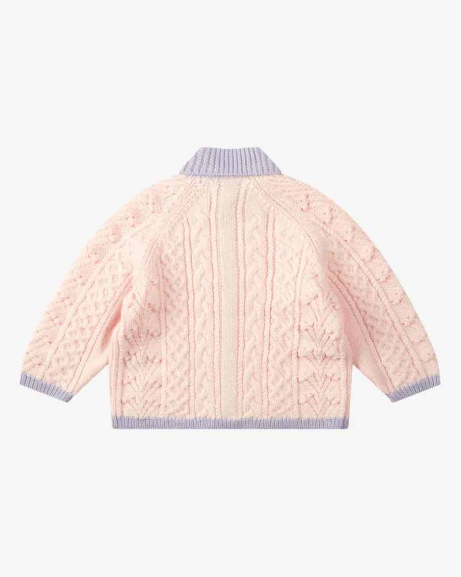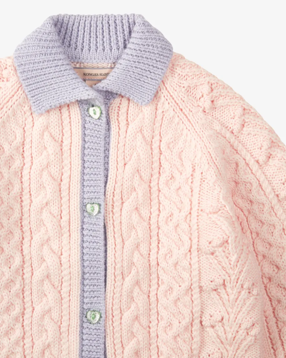 Emma Strickjacke für Babys von Konges Slojd in Rosé und Flieder. DänischesDesign für Babys & Kinder – nachhaltig, stylisch, durchdacht. Auch dieses Modellbegeistert mit hochwertiger Merinowolle, die einen besonders weichen Griffverspricht. Das klassische Zopfstrickmuster in Kombination mit kontrastfarbenenDetails und herzförmigen Knöpfen rundet den süßen Style harmonisch ab.