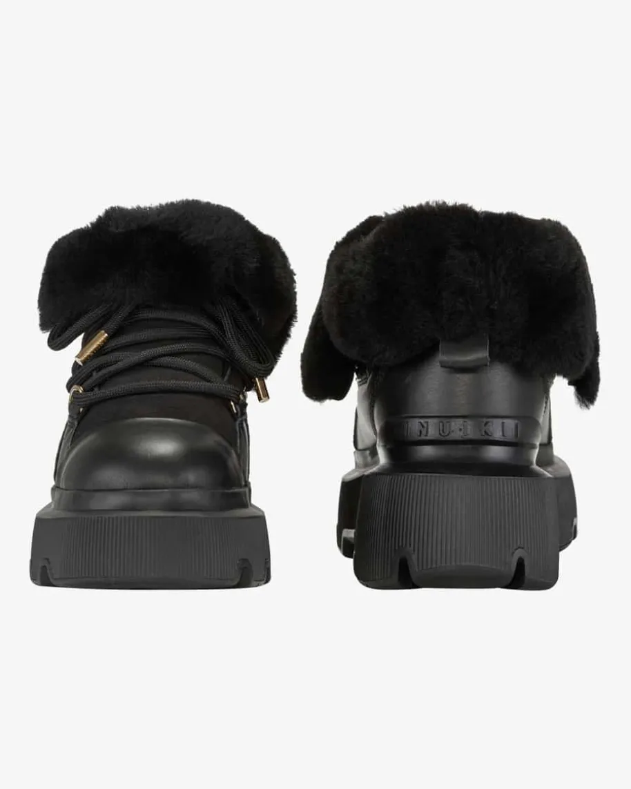 Endurance Trekking Boots für Damen von Inuikii in Schwarz. Zeitloses Design inVerbindung mit funktionalem Komfort zeichnen dieses Modell aus. Während diewasserabweisende sowie schneedichte Eigenschaft einen praktischen Begleiterkreiert, hält Sie die Lammfell-Innenseite auch an kalten Tagen warm. Zugleichpräsentiert sich das Modell dank der markanten Plateau-Sohle sowie derhochwertigen Velours-und Glattleder-Verarbeitung in modischer und zugleichstilvoller Aufmachung.