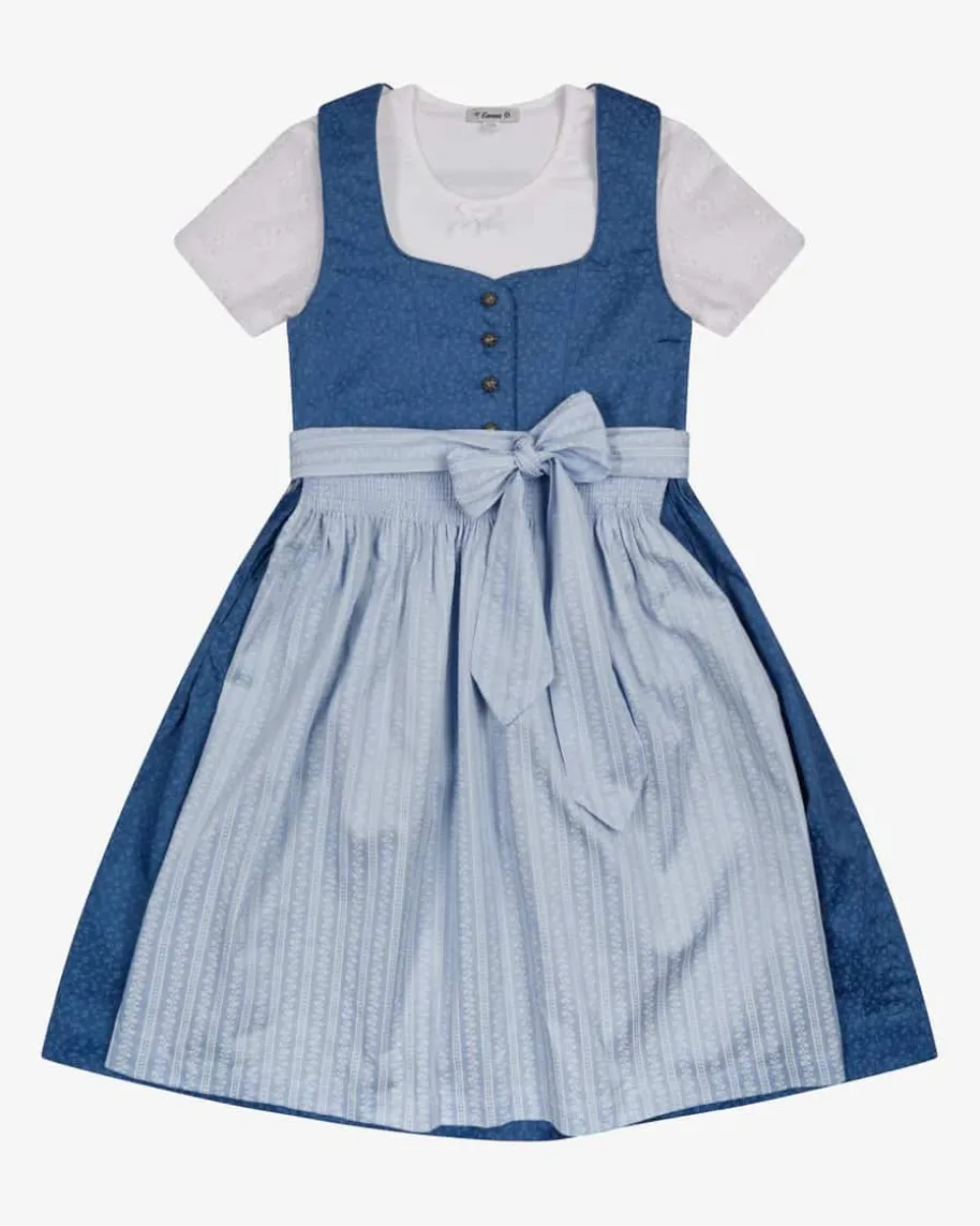Erika Dirndl mit Bluse und Schürze für Mädchen von LODENFREY in Blau, Hellblauund Weiß. Dank der klassischen Schnittführung und dem dezenten Allover-Dessinist das Modell traditionell gehalten, während die Zierknöpfe und die floralgemusterte Schürze optische Highlights setzen.