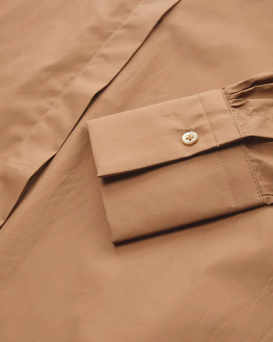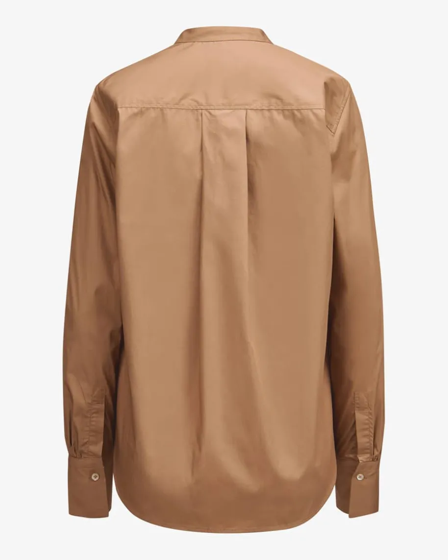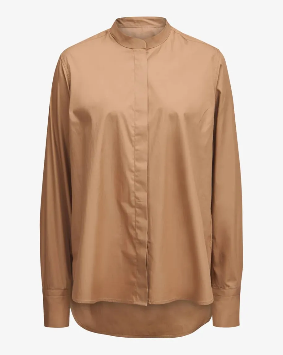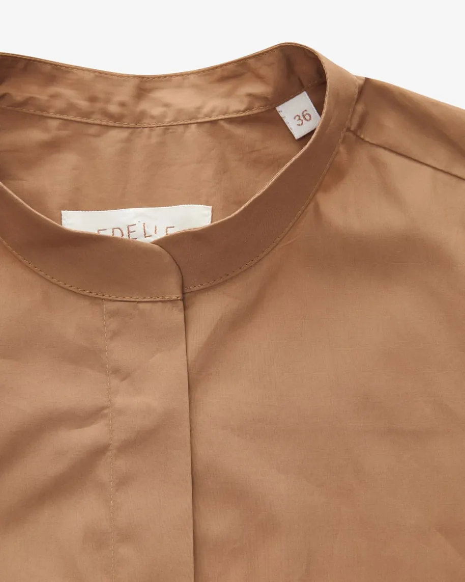 Eve Hemdbluse für Damen von Edelle in Camel. Das Modell in glatter Baumwoll-Qualität besticht dank klassischen Details mit leichtem Stehkragen alsstilsicherer Begleiter mit minimalistischem Charme und Office-Charakter. Casualzur Jeans oder schick zur Stoffhose und Pumps kombinierbar.