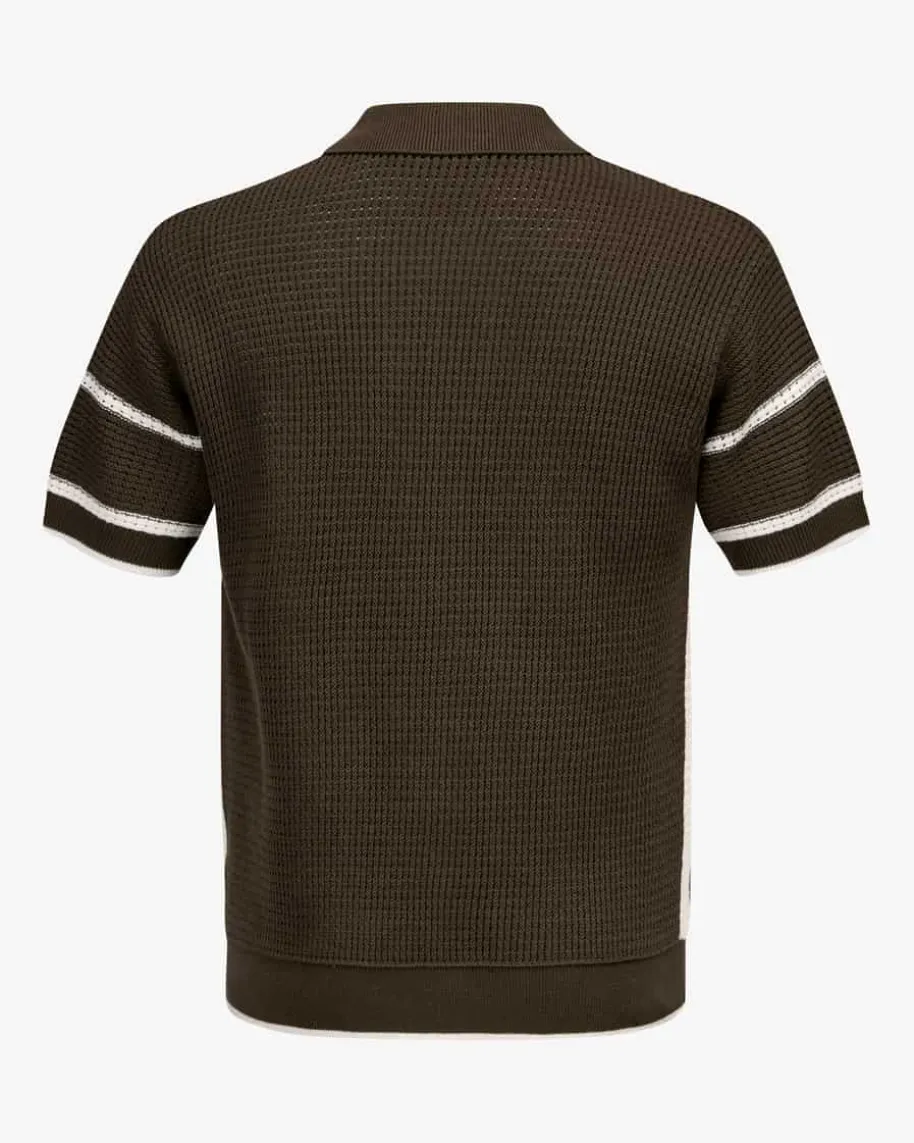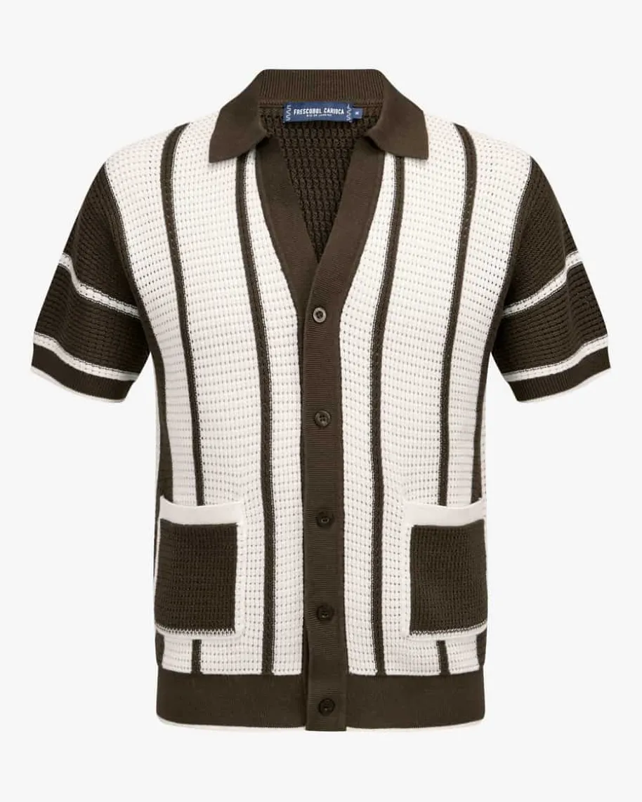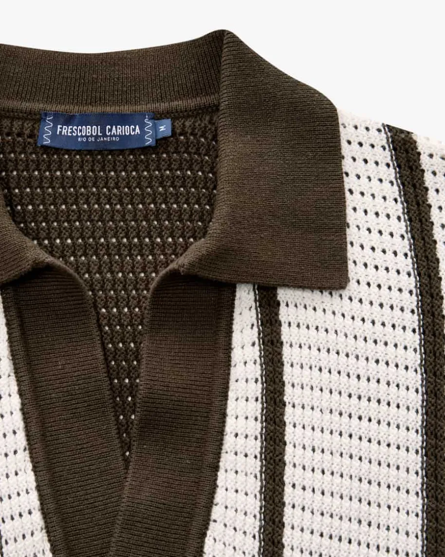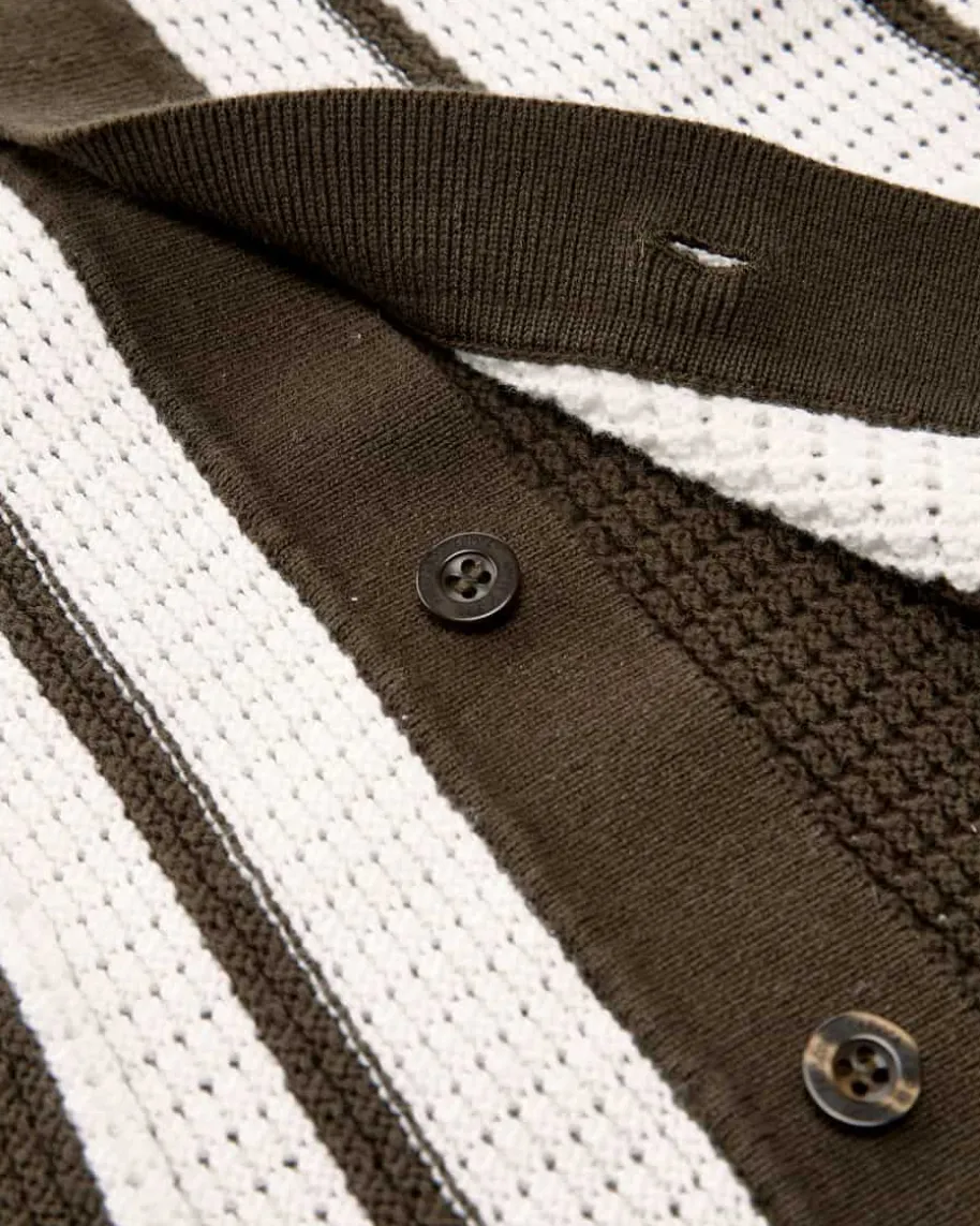 Fabricio Strickhemd für Herren von Frescobol Carioca in Oliv und Weiß. Daskurzärmlige Modell besticht dank der gröberen Strick-Qualität mit angenehmenTragemomenten, während das Streifen-Dessin in Kontrastfarbe modische Highlightssetzt.