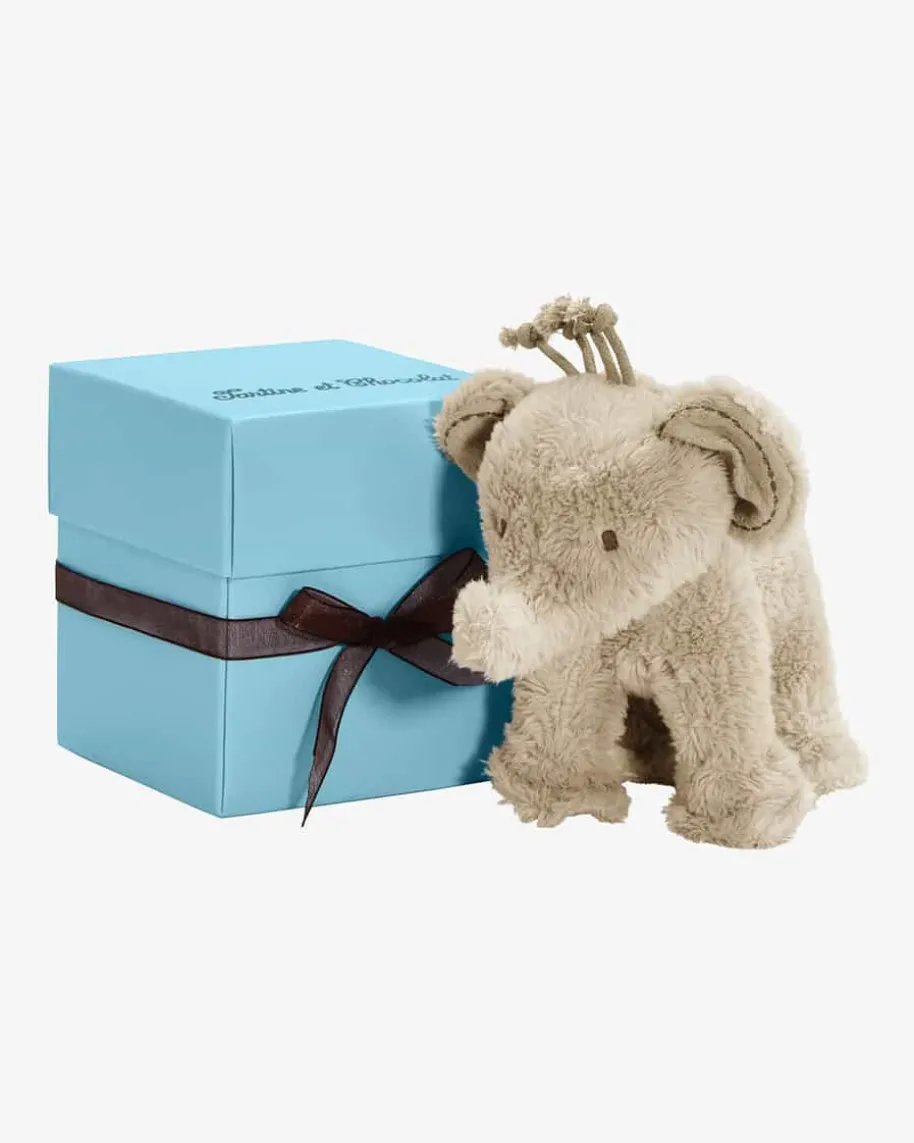 Plüsch-Elefant von Tartine et Chocolat in Taupe. Ferdinand ist ein kuscheliger Spielgefährte ebenso für kleine wie für große Kinder. Mit seinem flauschigen, taupe-farbenen Fell ist das Stofftier ein toller Schmusepartner. Neben einem süßen Haarbüschel auf dem Kopf verstärken auch die stoffwattierten Ohren des Elefanten die niedliche Optik. Für Abwechslung und Spaß beim Greifen sorgt die mit feinen Kunststoffperlen gefüllte Partie am Bauch. Durch die auf dem Rücken eingestickten Initialen von Tartine et Chocolat wird das Plüschtier zum echten Hingucker. Inklusive der passenden Geschenkschachtel ist der Kuscheltier-Elefant immer eine besonders gelungene Überraschung und somit das perfekte Geschenk, zum Beispiel für Geburtstage oder die Taufe.