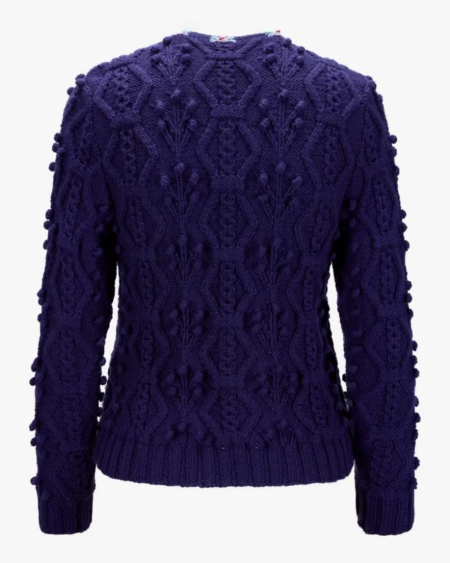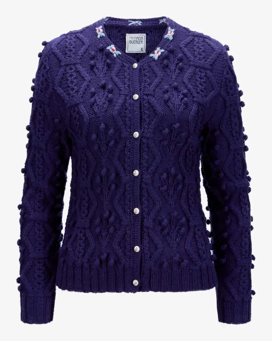 Finny Trachten-Strickjacke für Damen von Michaela Buerger in Beere. Diehochwertige Woll-Qualität in handgestrickter Verarbeitung punktet mit besondererStruktur, während stilvolle Knöpfe sowie florale Zierstickereien dastraditionelle Modell mit femininem Charme vollenden.