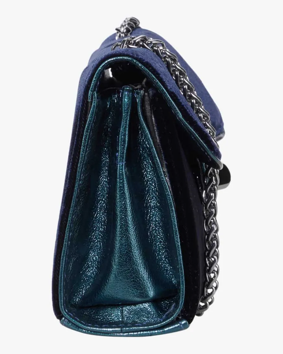 Fiona Trachten-Umhängetasche für Damen von Kinga Mathe in Nachtblau. Das Modellbesticht durch die Kombination aus edler Samt-Optik sowie hochwertiger Leder-Qualität in stilvoller Aufmachung, während die raffinierte Gliederkette dastraditionelle Trachten-Accessoire gekonnt abrundet.