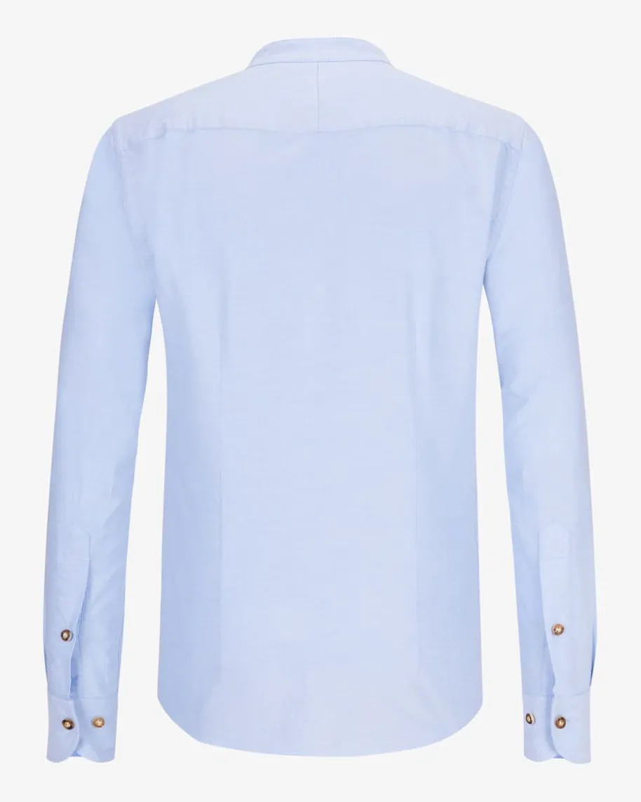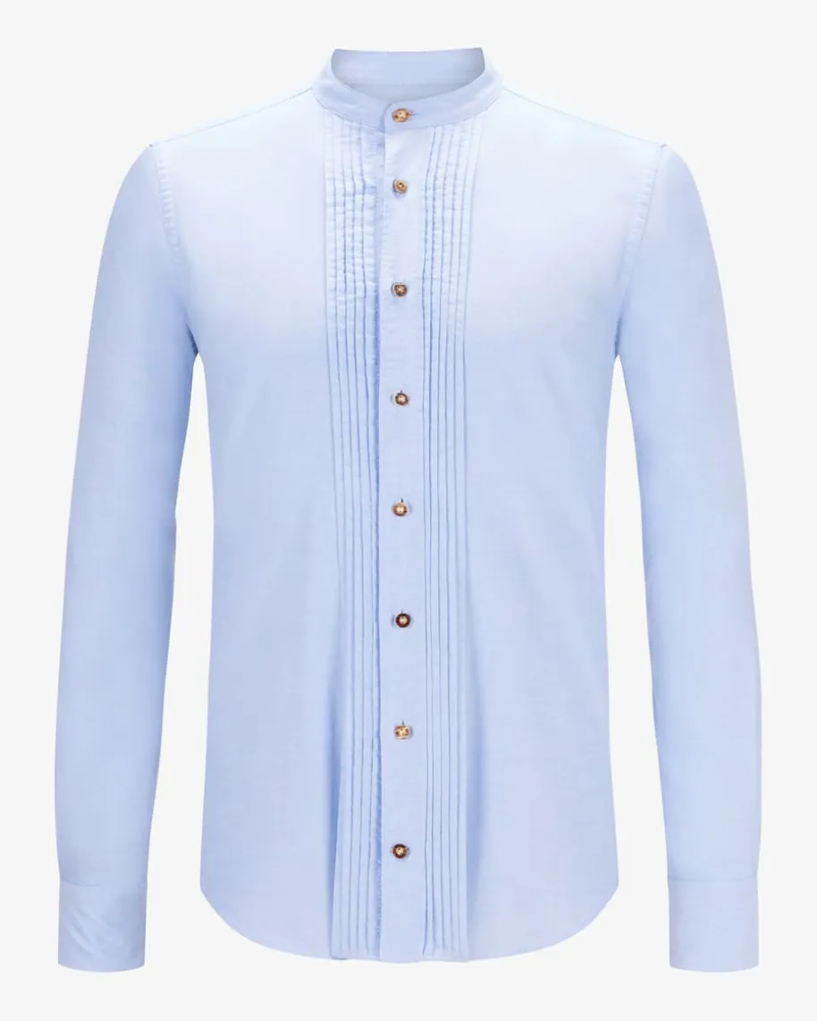 Fips Trachtenhemd für Herren von DU4 in Hellblau. Zeitlos und traditionellzugleichbegeistert das gerade geschnittene Modell aus hochwertiger Baumwolle. Elementewie ein kurzer Stehkragen, Hornknöpfe sowie variable Sport-Manschetten setzenklassische Akzente, während die aufgesetzte Knopfleiste mit modischen Biesen-Falten das Gesamtbild gekonnt abrundet.