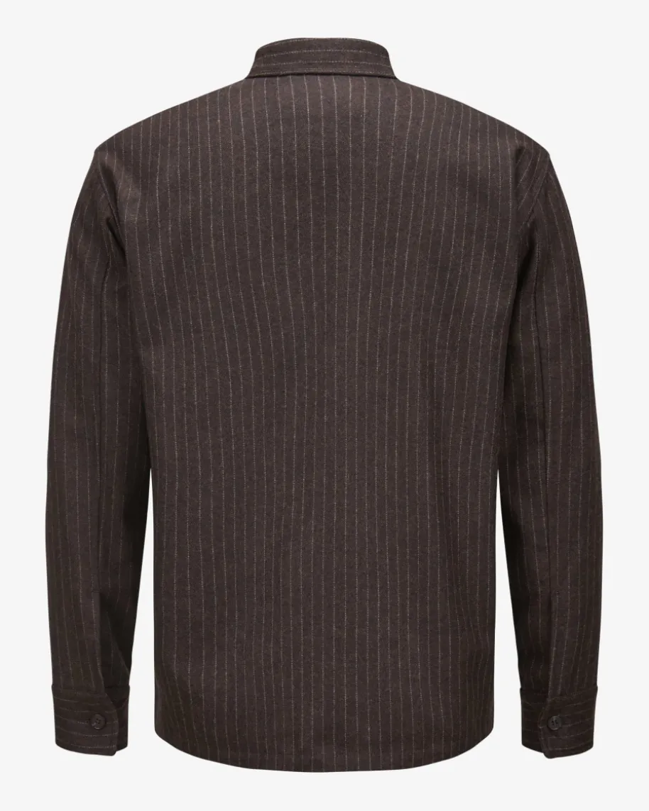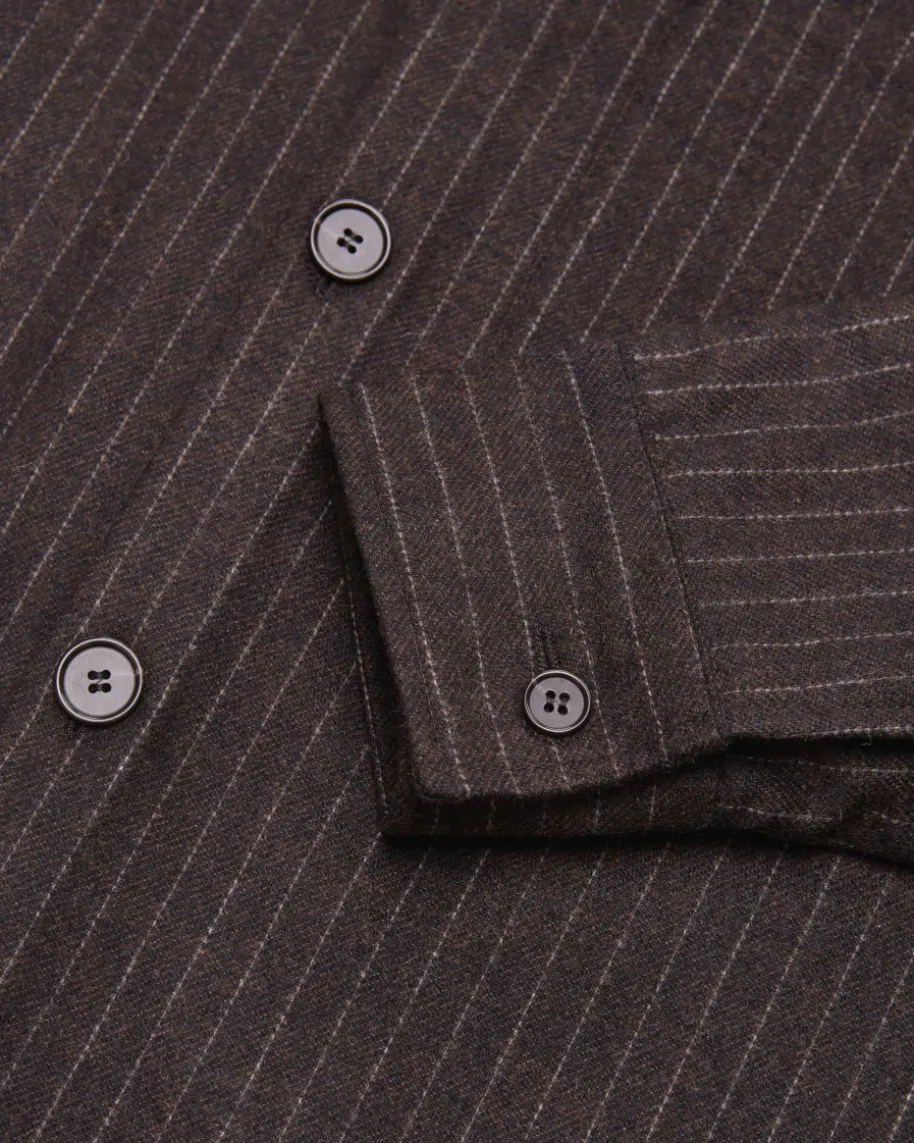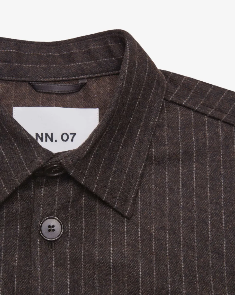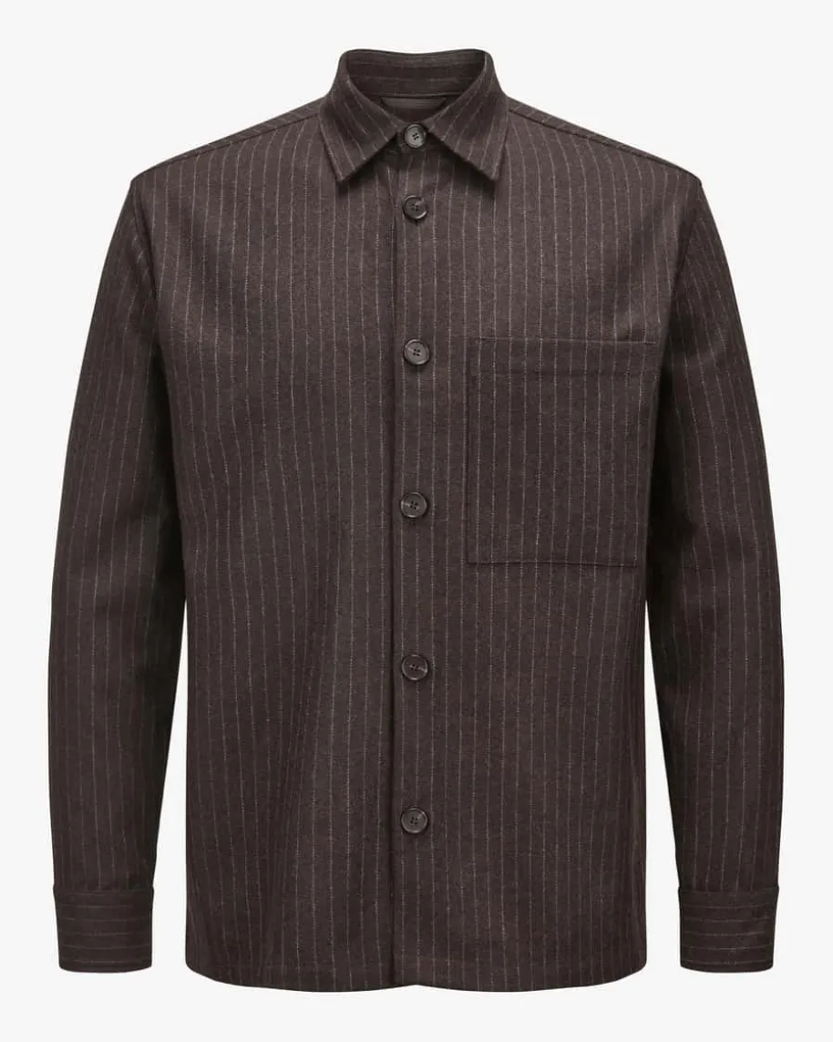 Freddy Overshirt für Herren von NN.07 in Braun und Creme. Dank recyceltem Woll-Mix besticht das Modell als angenehmer Favorit mit legerem Touch, welcher durchdas Nadelstreifen-Muster modern in Szene gesetzt wird.