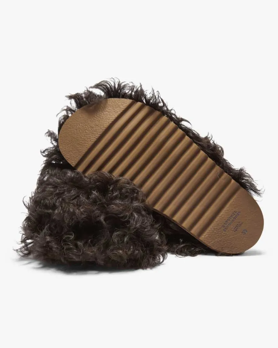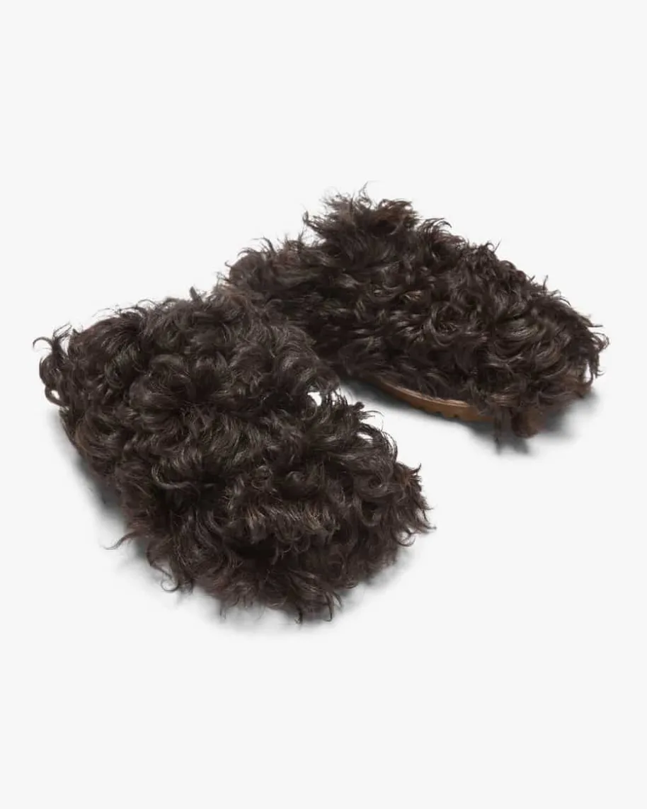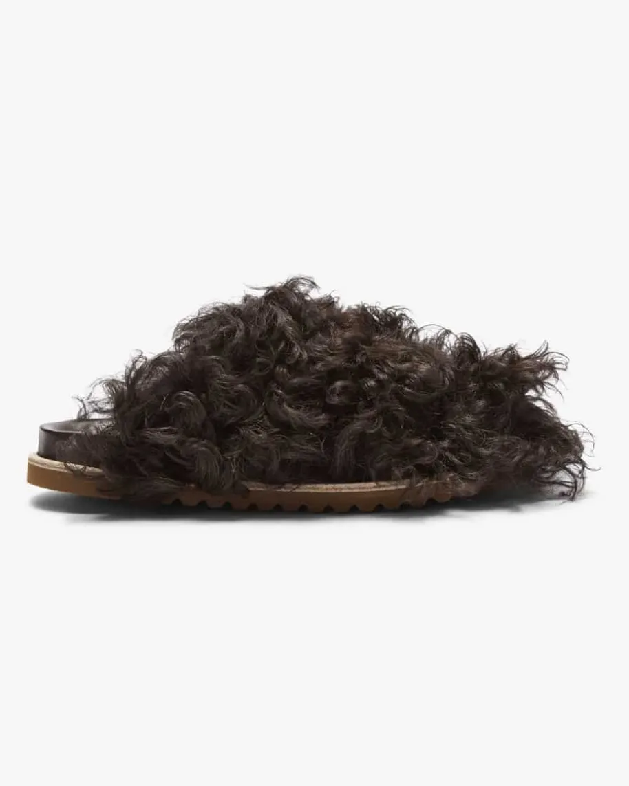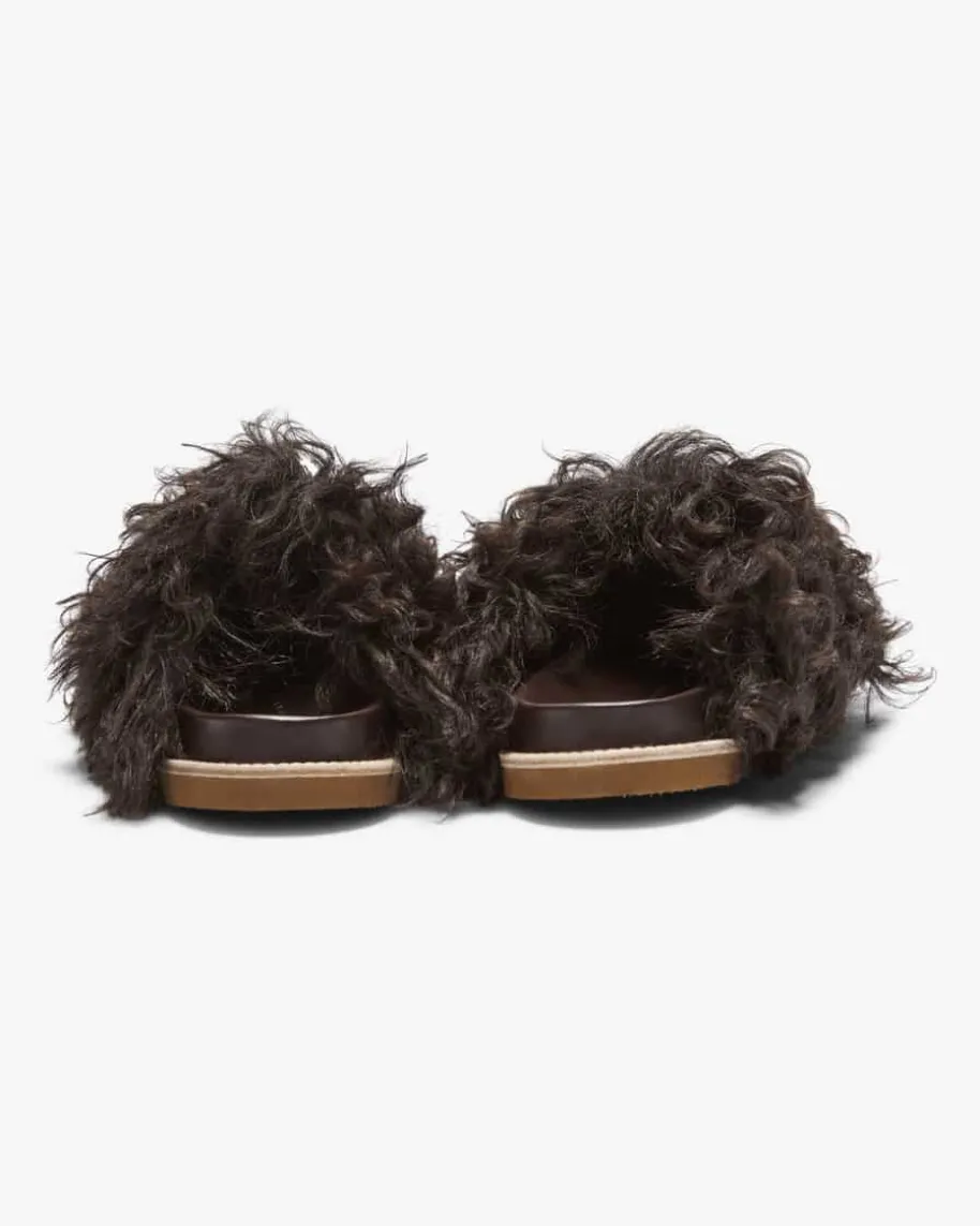 Furry Fantasy Pantoletten für Damen von Dorothee Schumacher in Braun. Das Modellaus Ziegenleder zeichnet sich durch das extravagante Design mit gelocktemSchafsfell-Besatz aus, während das Fußbett einen hohen Tragekomfort verspricht.