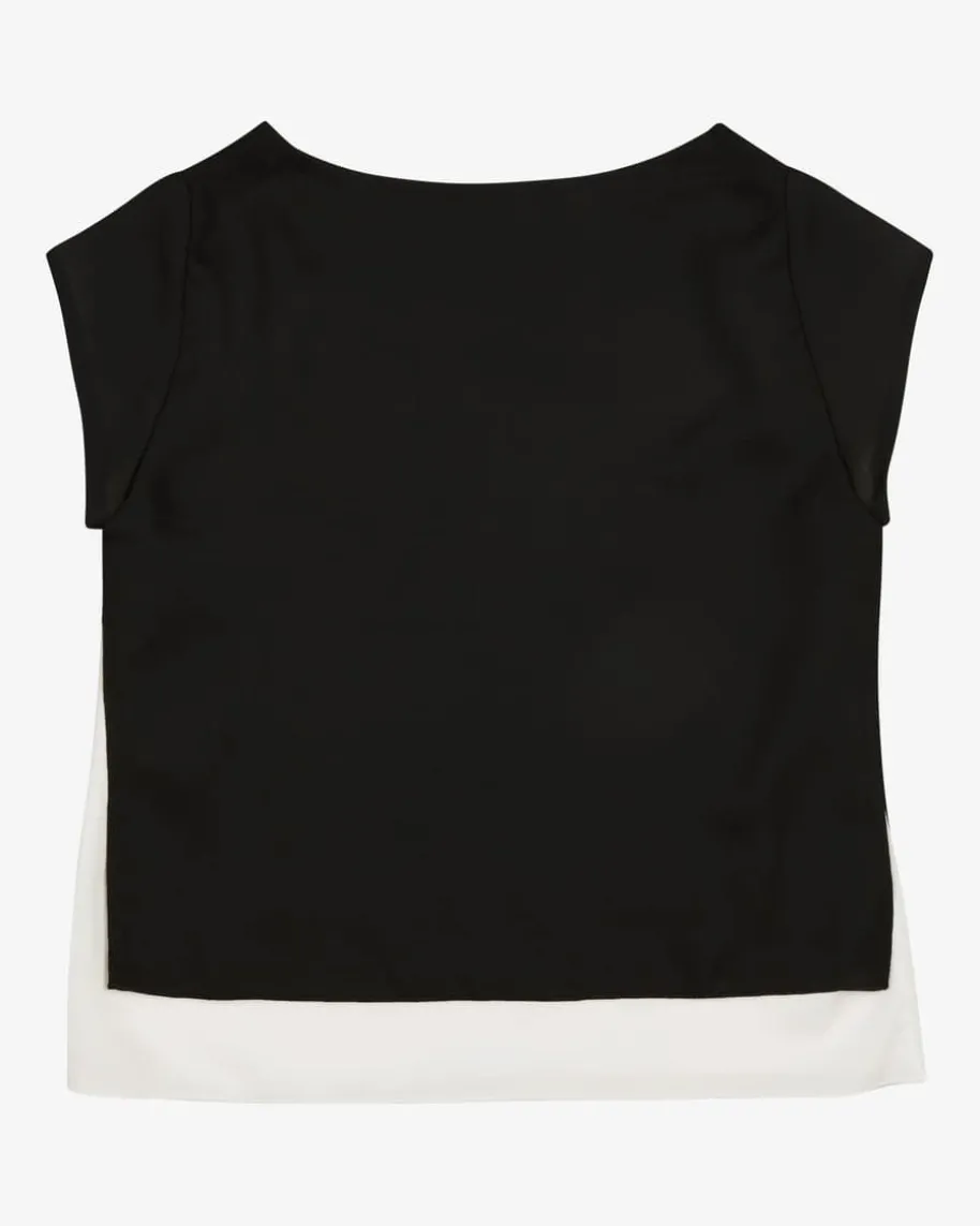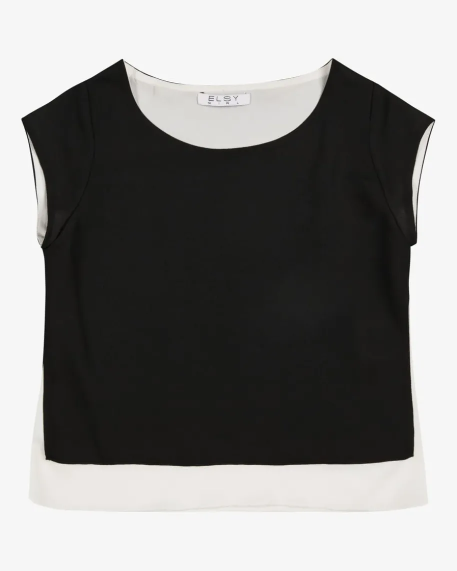 Geppina Blusentop für Mädchen von Elsy in Schwarz und Weiß. Das Modellpräsentiert sichmit den kontrastierenden Lagen modisch, während die Seitenschlitze einenverspielten Look kreieren.
