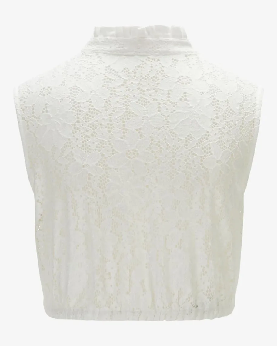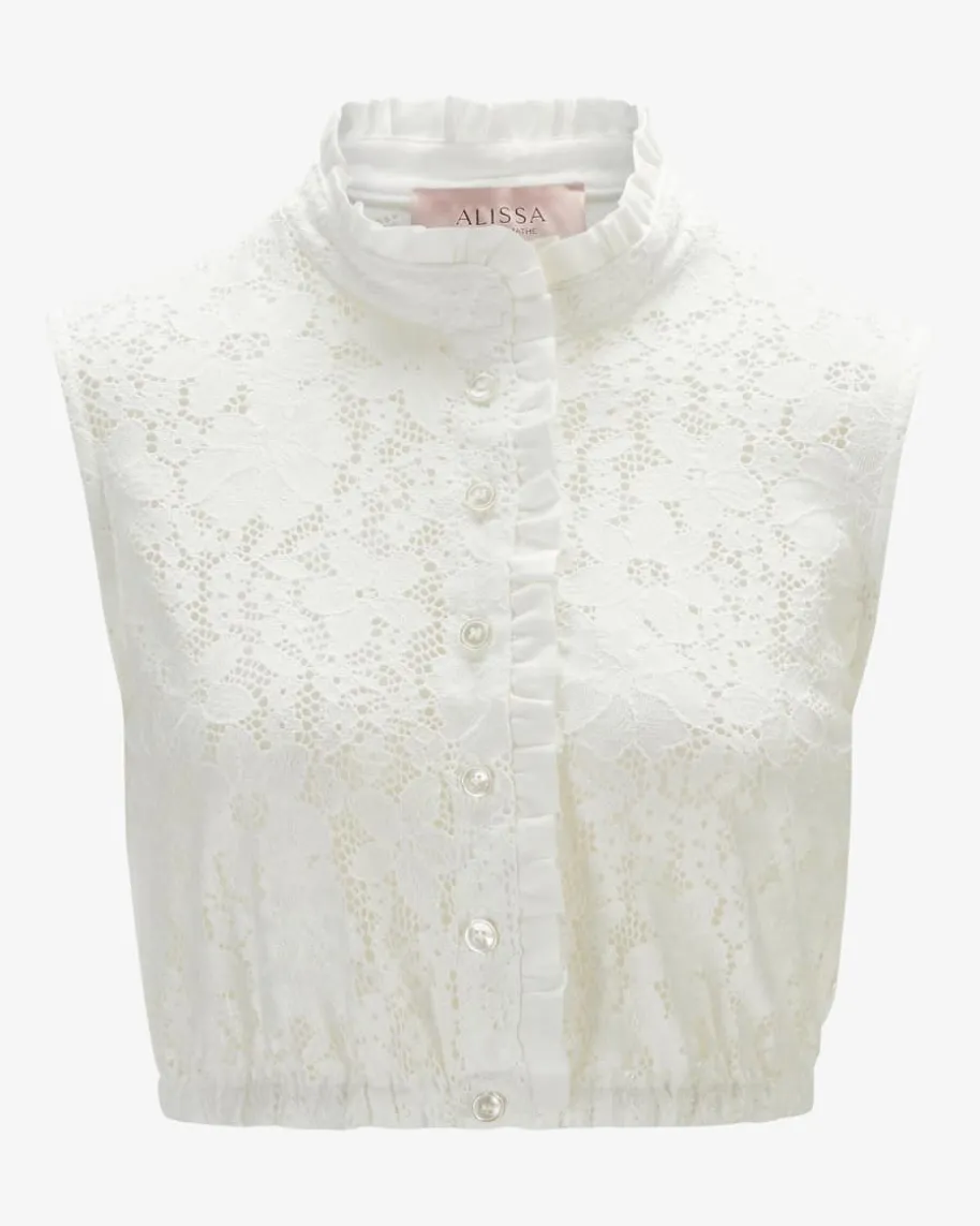 Gina Dirndlbluse für Damen von Alissa by Kinga Mathe in Weiß. Das ärmelloseModell überzeugt dank der floralen Loch-Spitze in traditionell-femininerAufmachung, während Rüschen-Details den romantischen Trachten-Look gekonntvollenden.