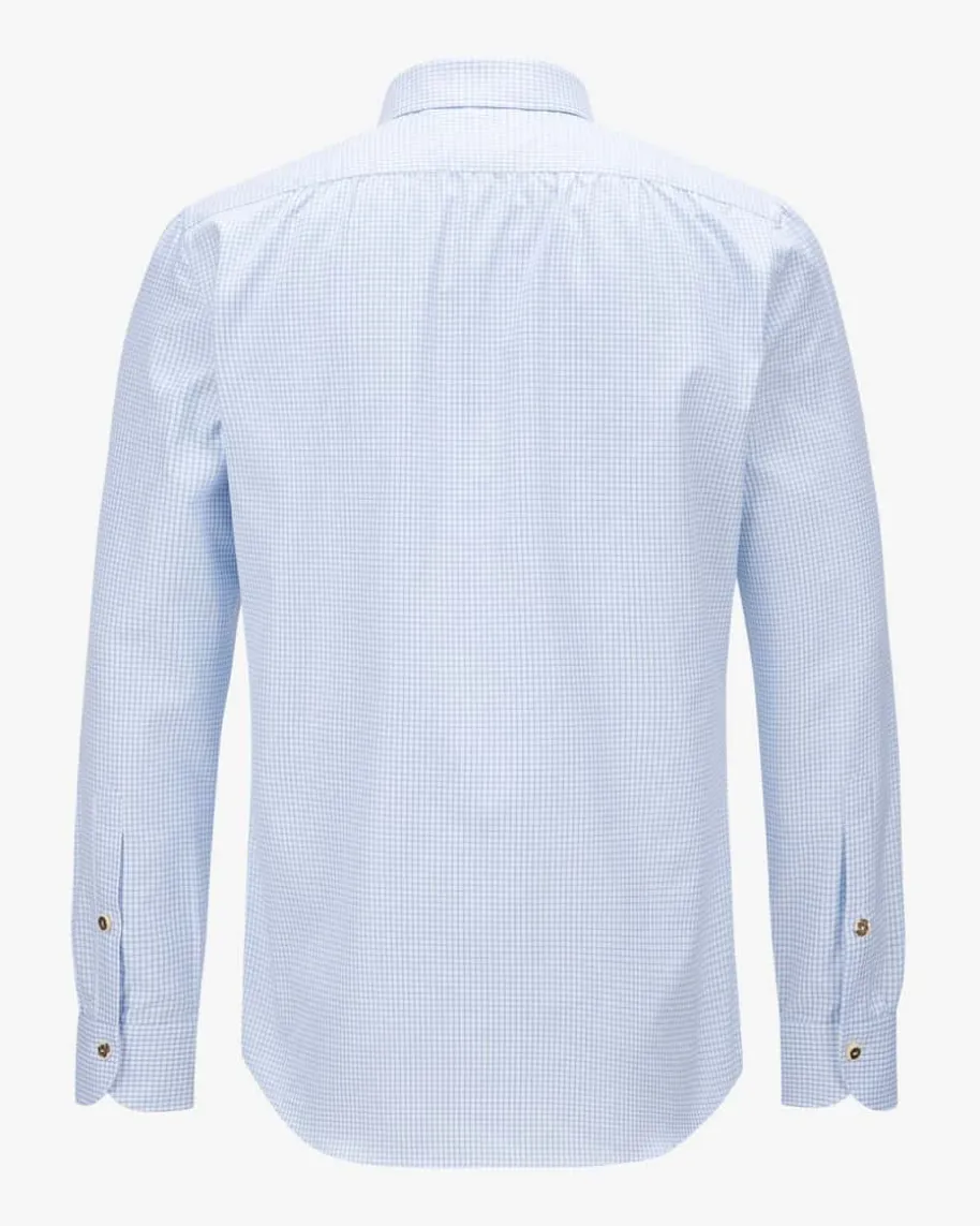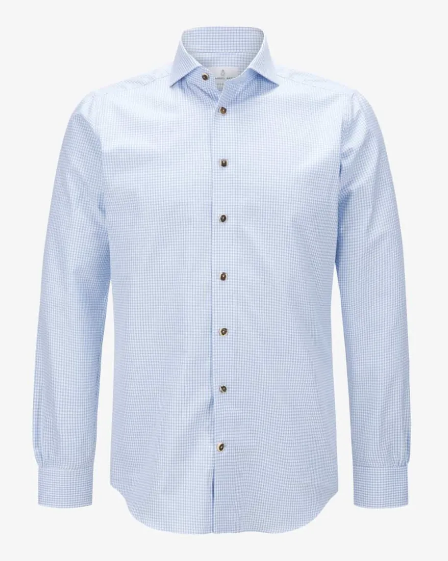 Harvard Trachtenhemd für Herren von Emanuel Berg in Hellblau und Weiß. DasModell überzeugt durch die schmale Passform und die feine Webqualität ausangenehmer Baumwolle, während rustikale Knöpfe besondere Akzente setzen.