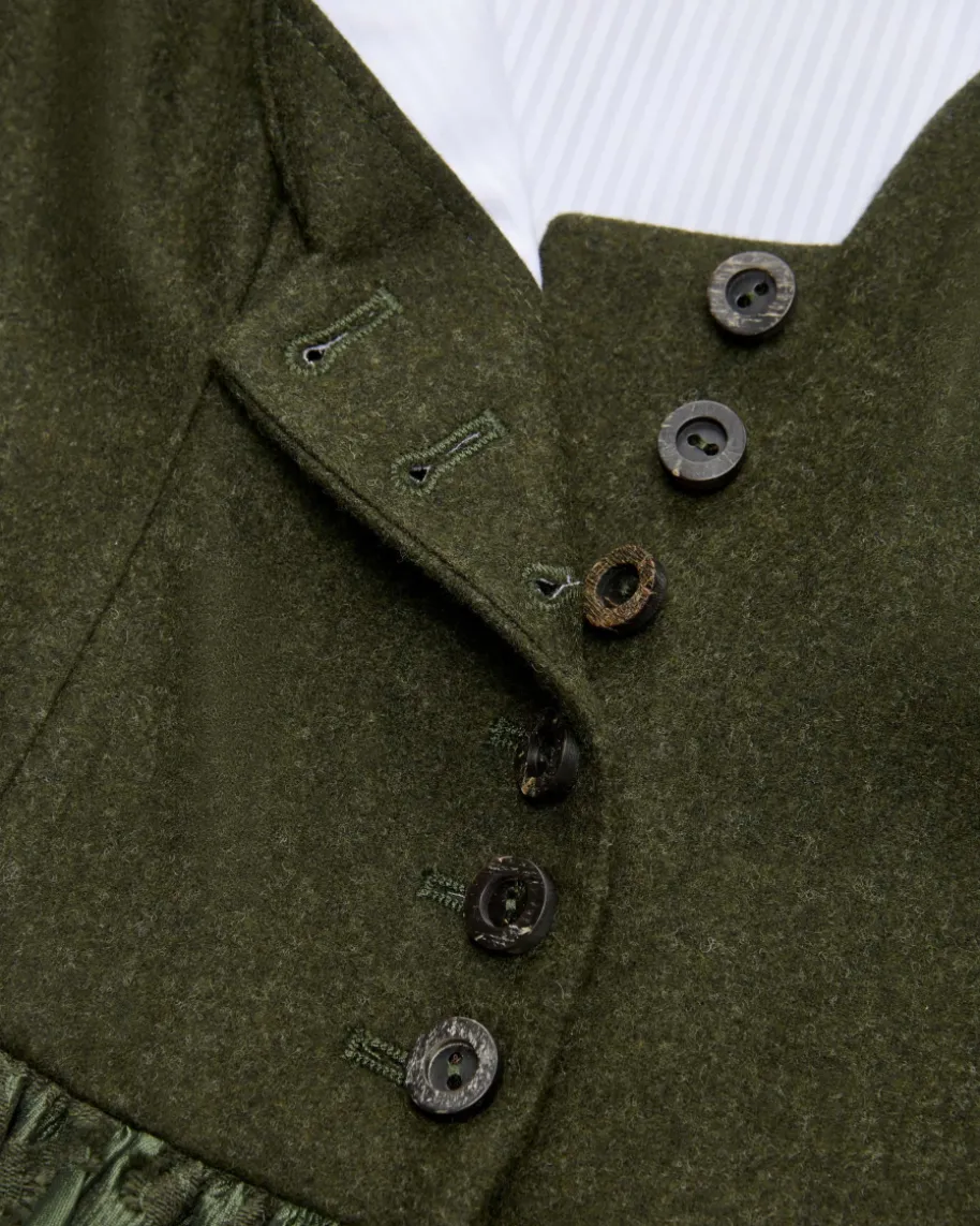 Helene Midi-Leinendirndl mit Schürze für Damen von Elisabethund Franzl inDunkelgrün. Edle Knöpfe, hochwertige Materialien undliebevolle Details machen jedes Dirndl zu einem Highlight.Dieses Modell kombiniert ein klassisches Schurwoll-Miedermit einem Rock in floraler Stickerei – traditionell mitmodernem Twist. Jedes Dirndl kommt mit passendem Haarband –die feine Borte am Schürzenbund findet sich darin wieder fürden perfekten Look bis ins Detail.