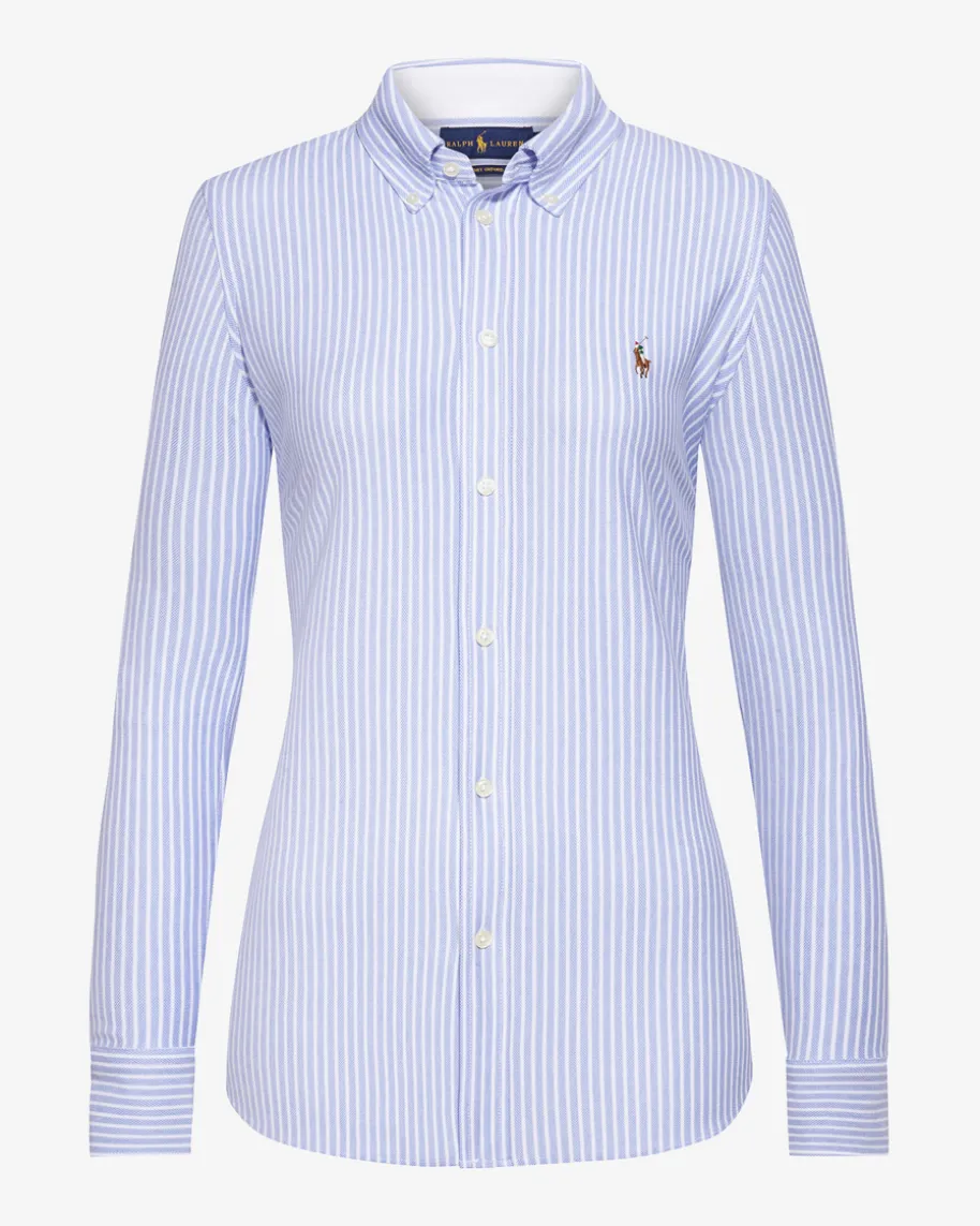 Hemdbluse für Damen von Polo Ralph Lauren in Hellblau. Dank elastischer Oxford-Qualität und Taillenabnähern auf der Rückseite verleiht das Modell eine feminine Silhouette. Das stilvolle Streifen-Dessin und eine charakteristische Logo-Stickerei sorgen für einen modischen Look, während Button-Down-Kragen, durchgehende Knopfleiste als auch Einknopf-Manschetten mit geknöpften Ärmelschlitzen von klassischer Eleganz zeugen.