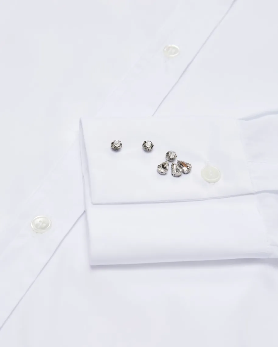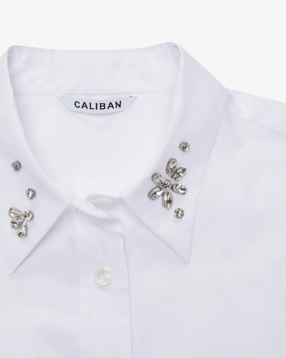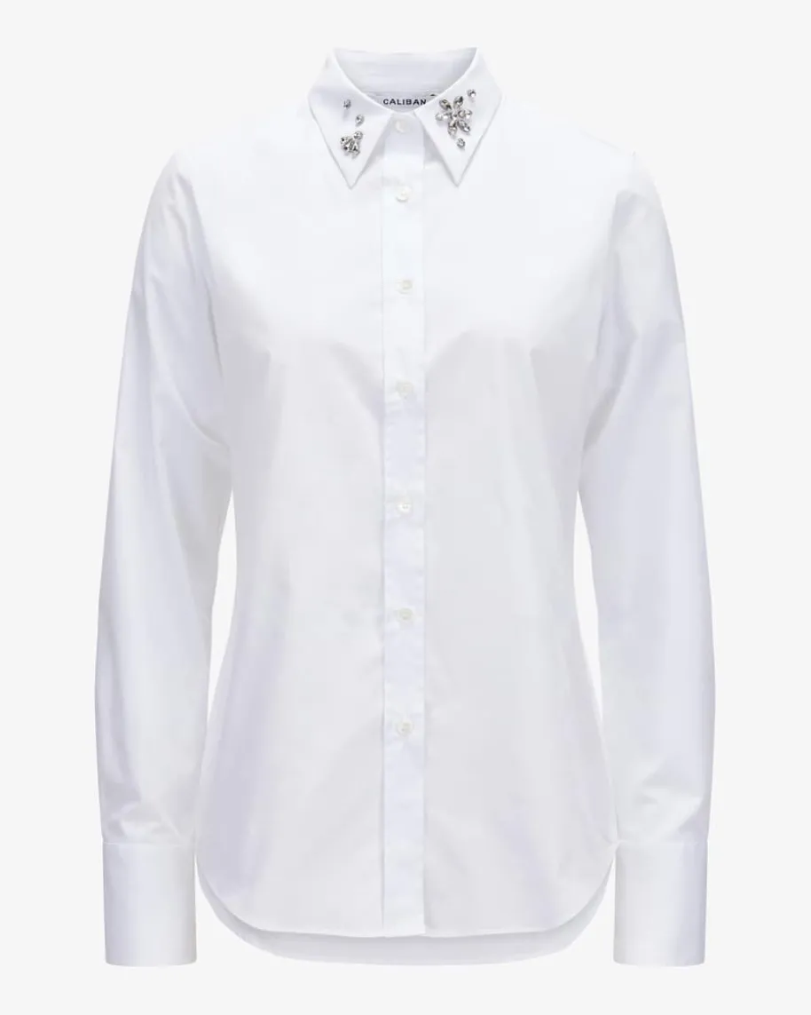 Hemdbluse für Damen von Caliban in Weiß. Das Modell besticht in femininerAufmachung dank taillierter Passform und hochwertiger Schmuckstein-Applikationen, während die Baumwoll-Qualität angenehme Tragemomente verspricht.
