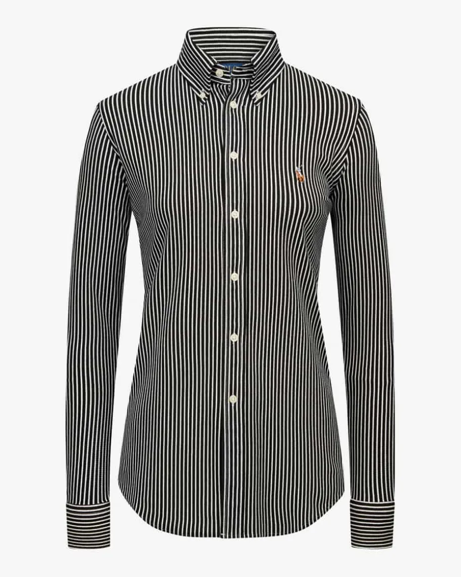 Hemdbluse für Damen von Polo Ralph Lauren in Schwarz und Weiß. Klassisch-elegantpräsentiert sich das Modell aus angenehmer, elastischer Oxford-Baumwolle inStrick-Optik. Dank der Verbindung aus klassischen Details mit charakteristischerPoloreiter-Stickerei und des Streifen-Dessins avanciert die Bluse zum zeitlosenFavoriten, der in keiner Garderobe fehlen darf.
