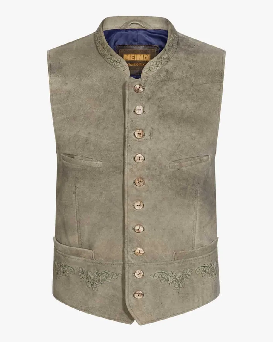 Hirschkogel Trachten-Lederweste für Herren von Meindl in Old Grey. Aus sämischgegerbtem Rehleder gefertigt, präsentiert sich das Modell in rustikalerAufmachung und überzeugt durch das zeitlose Design. Aufwendige Hirsch-Stickereien sowie traditionelle Knöpfe vollenden den maskulinen Look gekonnt.