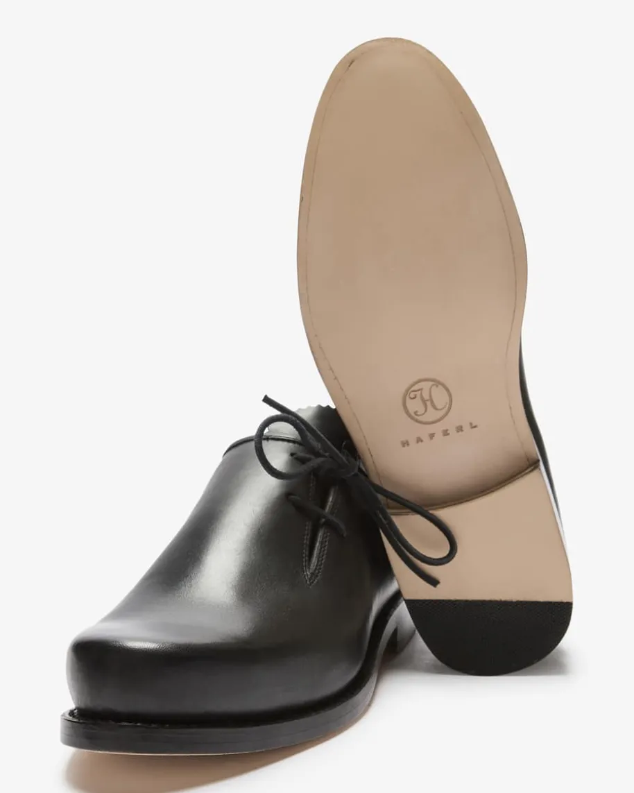Hubert Haferlschuhe für Herren von Haferl in Schwarz. Solide, klassisch und vonhöchster Qualität – So lautet das Motto des Unternehmens. Für zwiegenähteHaferlschuhe sind etwa 200 Arbeitsschritte erforderlich, welche dentraditionellen Schuh äußerst stabil, robust und langlebig machen.