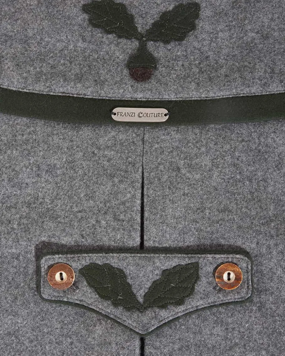 Hunde-Janker von Franzi Couture in Hellgrau und Mossgrün. Hundemode nach Maß -Das traditionelle Modell aus bayerischem, in Bayern gefertigtem Loden eignetsich perfekt für einen Ausflug auf das weltbekannte Oktoberfest. Mitkontrastierenden Paspeln sowie farblich passender Innenseite setzt der Jankermodische Akzente, während dezente Eichblatt Applikationen das Design rustikalvollenden.