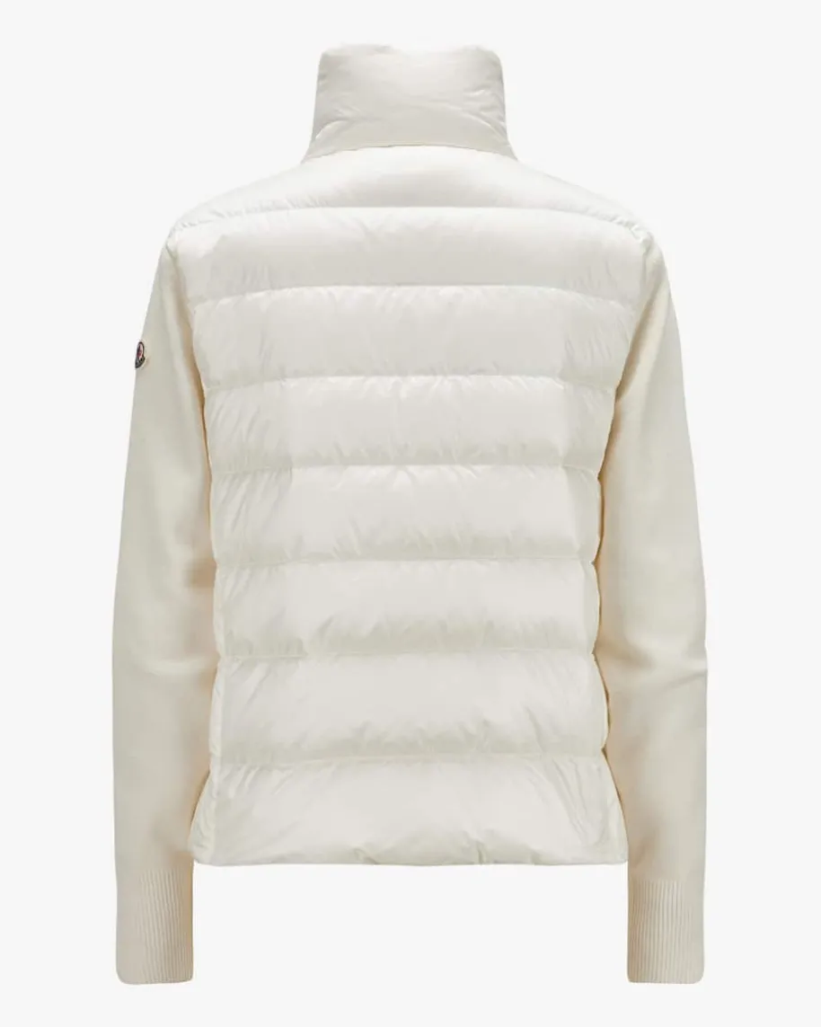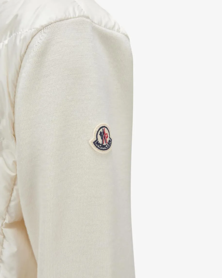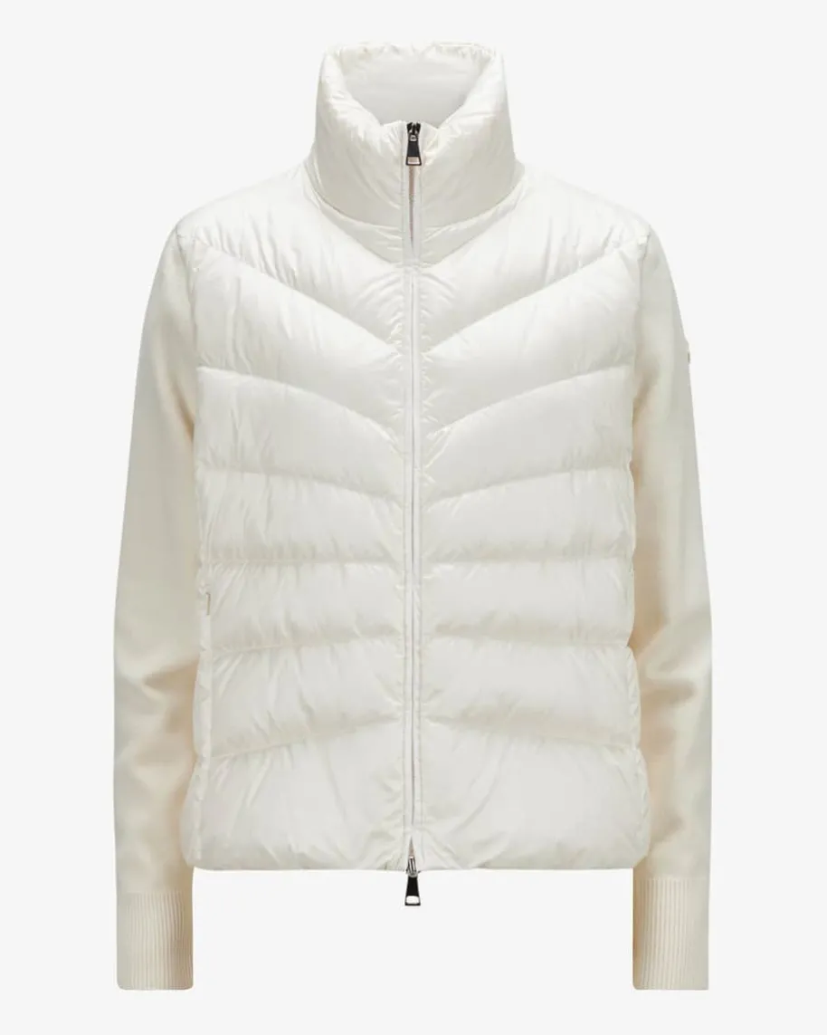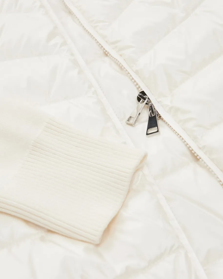 Hybrid-Daunenjacke für Damen von Moncler in Ecru. Denkt man an hochwertige,warme Daunenjacken, kommt einem unweigerlich das italienische TraditionslabelMoncler in den Sinn. Auch mit diesem Modell präsentiert das Label dank derhochwertigen Daunen-Feder-Füllung einen optimalen Begleiter für dieÜbergangszeit, während die weichen Strick-Ärmel und die schmale Passform einenmodischen Fashion-Favoriten kreiert.