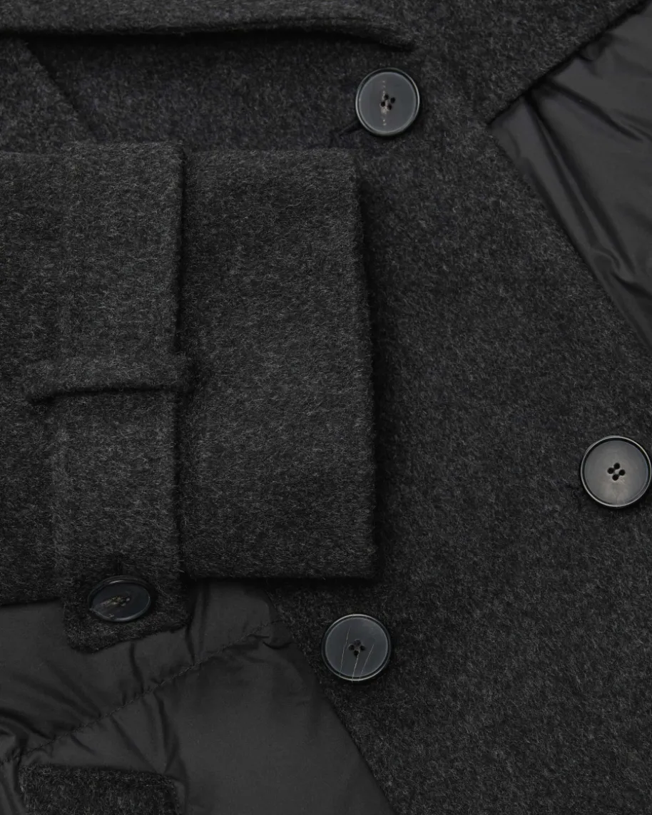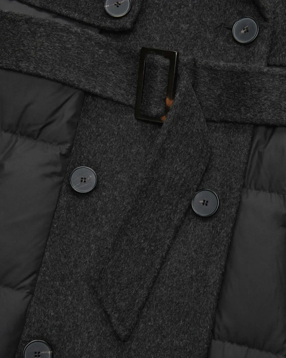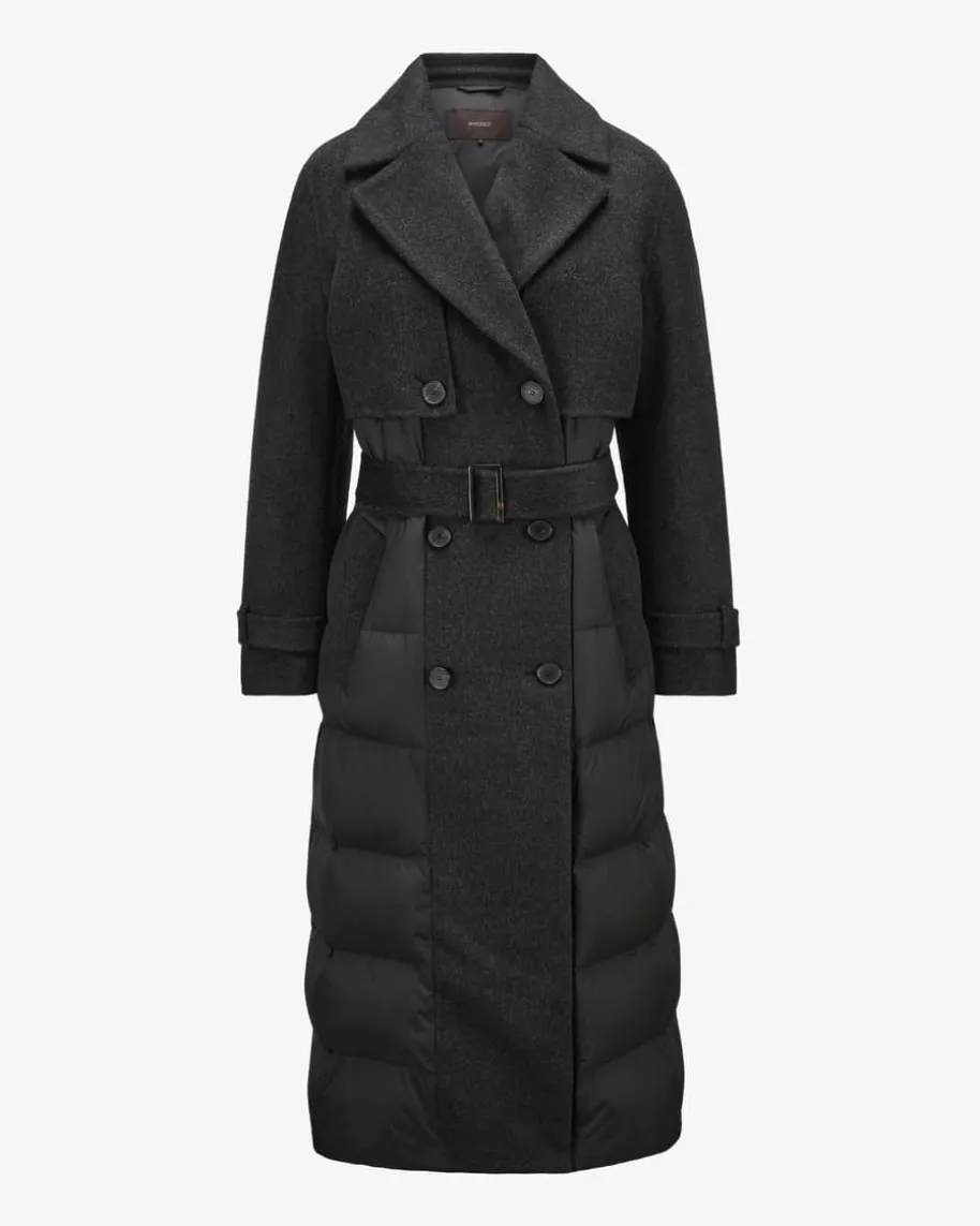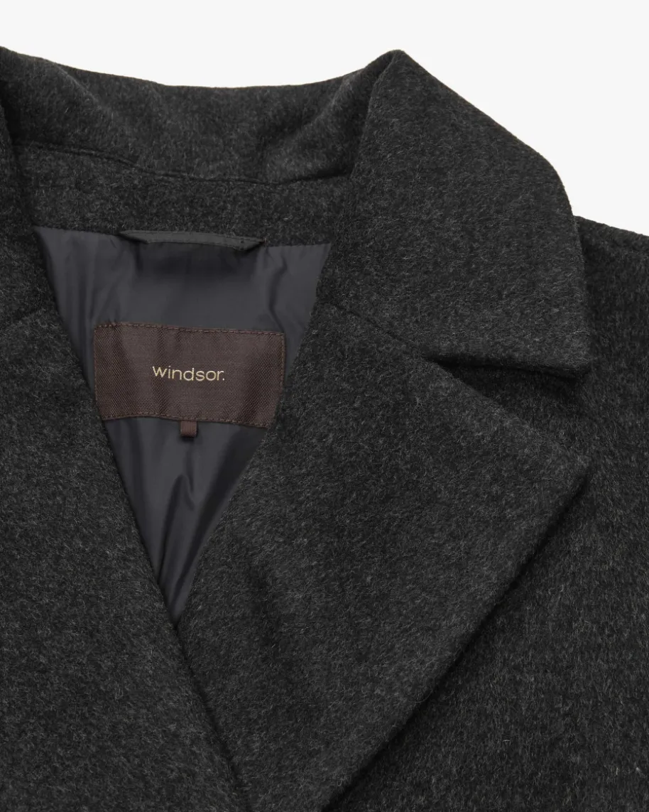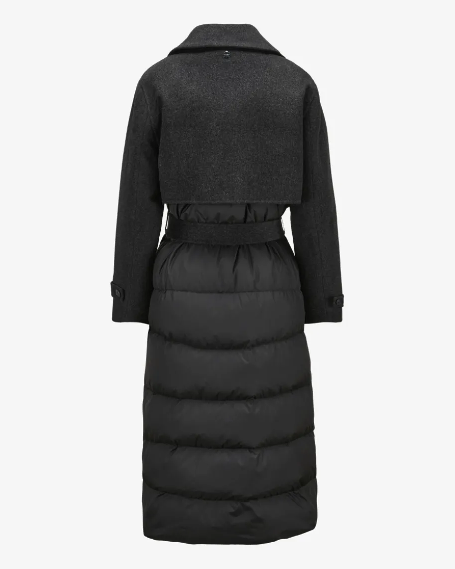 Hybrid-Daunenmantel für Damen von Windsor in Anthrazit und Schwarz. Das Modellüberzeugt dank dem raffinierten Material-Mix mit gesteppten Partien mit Daunen-Feder-Füllung und weichen Woll-Elementen als warmer Favorit mit besonderemCharakter, während die zweireihige Aufmachung sowie der taillierte Schnitt dasGesamtbild gekonnt vollenden.