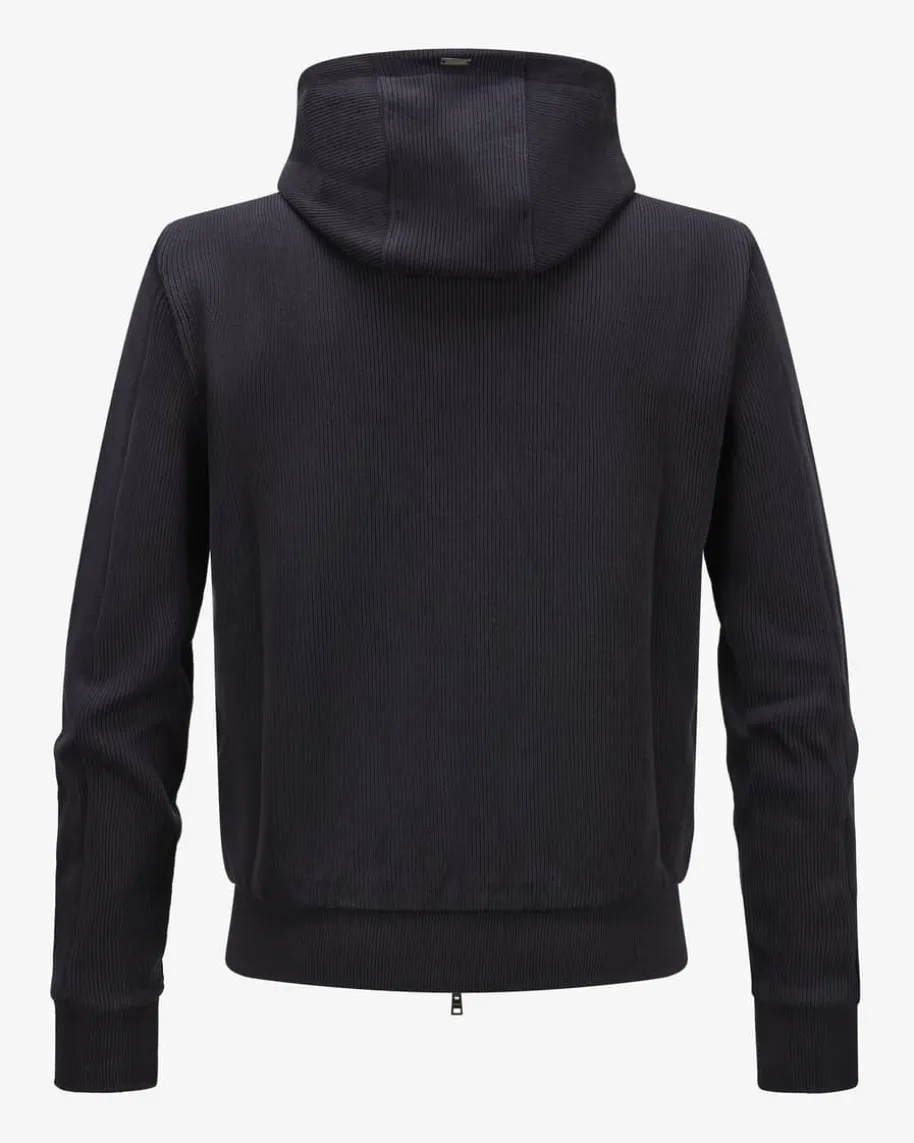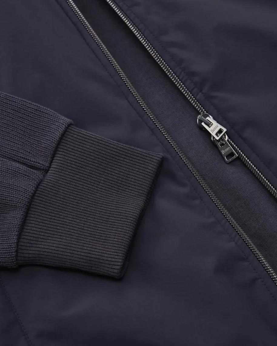 Hybrid-Strickblouson für Herren von Herno in Navy. Das maskuline Modellüberzeugt mit raffiniertem Material-Mix aus Baumwoll-Rippstrick und leichtwattierter Vorderseite. Die Blouson-Aufmachung mit Kapuze schafft einensportiven Begleiter für legere Outdoor-Looks.