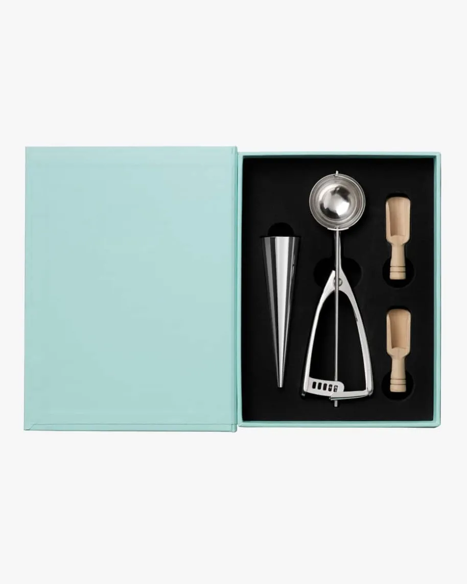 Ice Cream Set von Printworks in Hellblau, Weiß und Gold. Mitdiesem Setpräsentiert die Brand das perfekte Geschenk fürEisliebhaber. Dank der liebevolldesignten Aufbewahrungsbox überzeugt das Set auch als Deko.