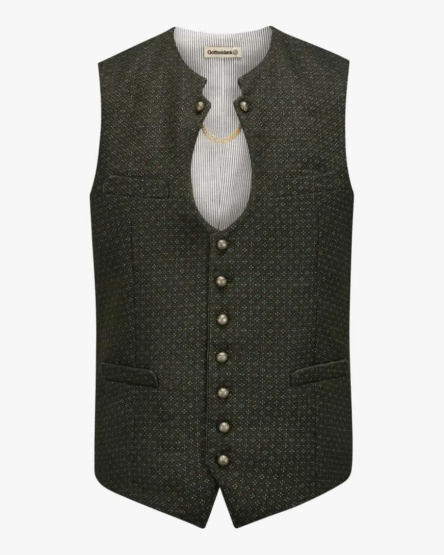 Ignaz Trachtenweste für Herren von Gottseidank in Bronzegrün, Türkis undSchwarz. Das edle Modell besticht durch die traditionelle Aufmachung mit Ketten-Detail, welche dank verzierter Kugelknöpfe und Samt-Paspeln stilvollunterstrichen wird. Zugleich setzt das strukturierte vorderseitige Muster denTrachten-Look modern in Szene.