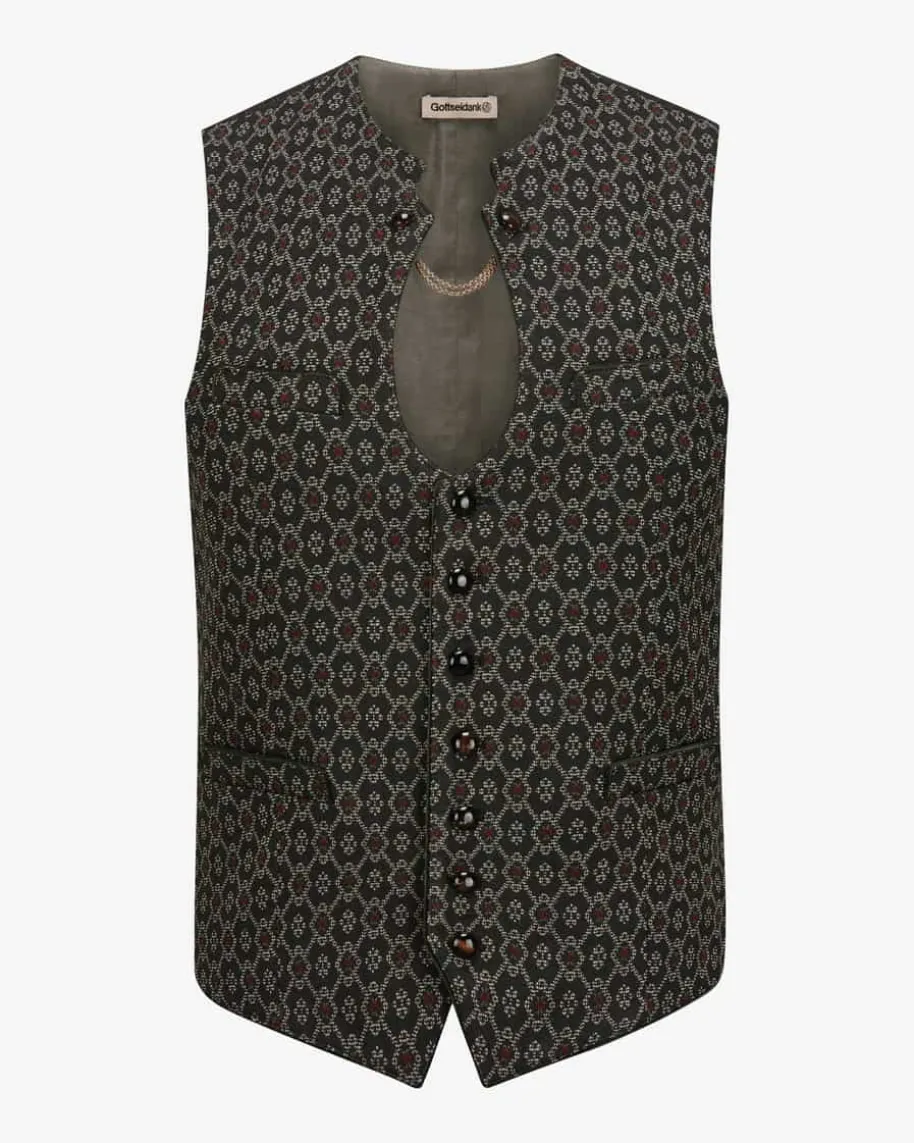Ignaz Trachtenweste für Herren von Gottseidank in Antikschwarz, Rot und Oliv.Das edle Modell besticht durch die traditionelle Aufmachung mit Ketten-Detail,welche dank changierender, marmorierter Knöpfe und Samt-Paspeln stilvollunterstrichen wird. Zugleich verleihen die Zierstickereien dem Trachten-Lookeinen besonderen Charakter.
